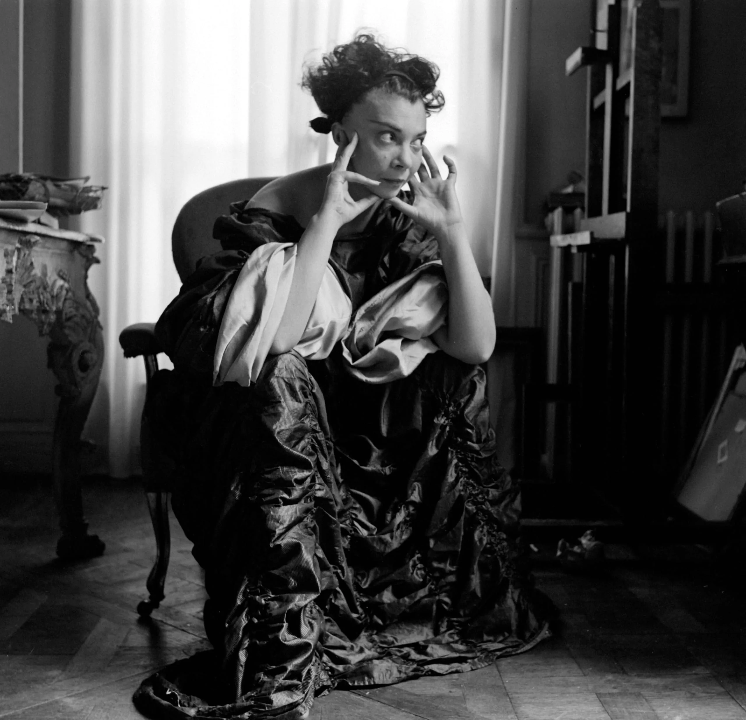 Black and white photograph of a woman in a voluminous dark silk gown seated in a wooden chair, hands raised to her face, fingers spread, in a softly lit interior