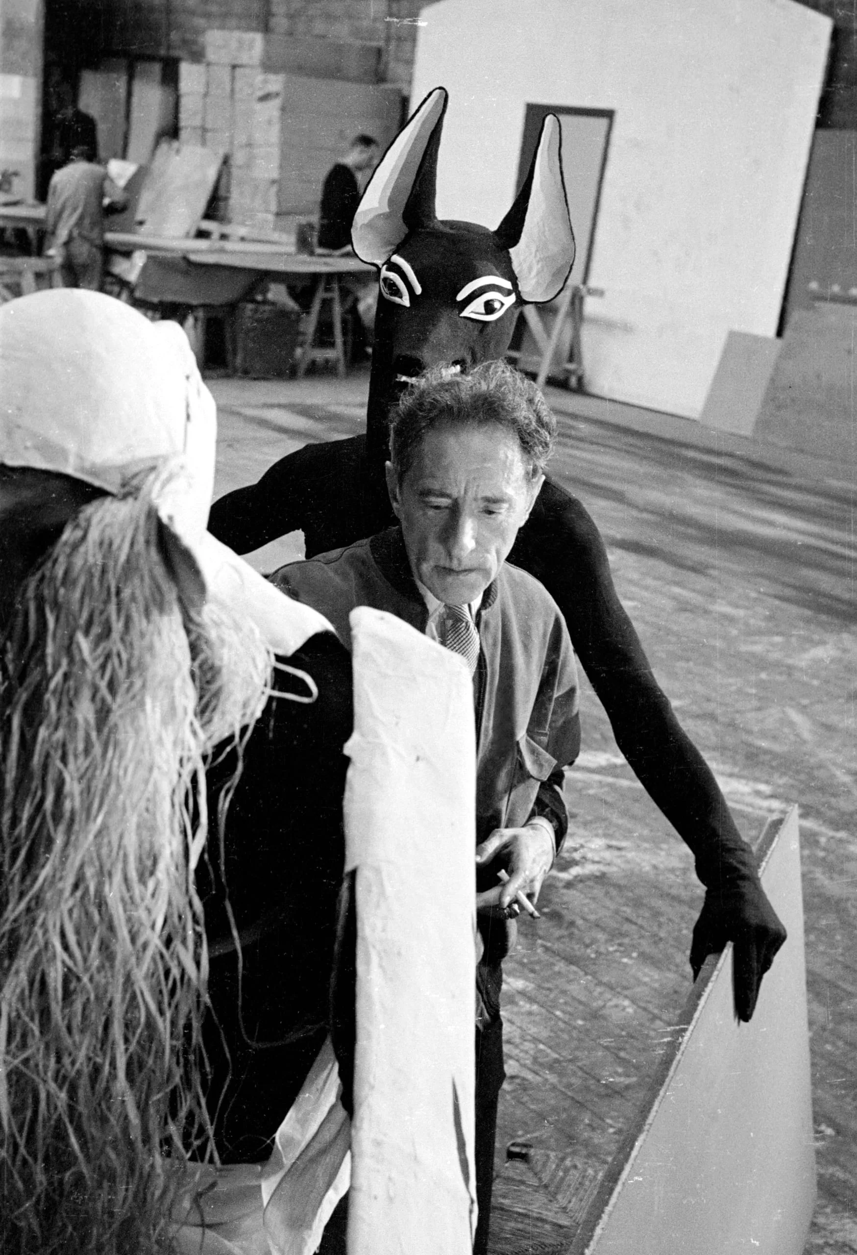 Black and white photograph of a man in a shirt and tie, cigarette in hand, standing before a person in a dark bull-head costume in a large studio space