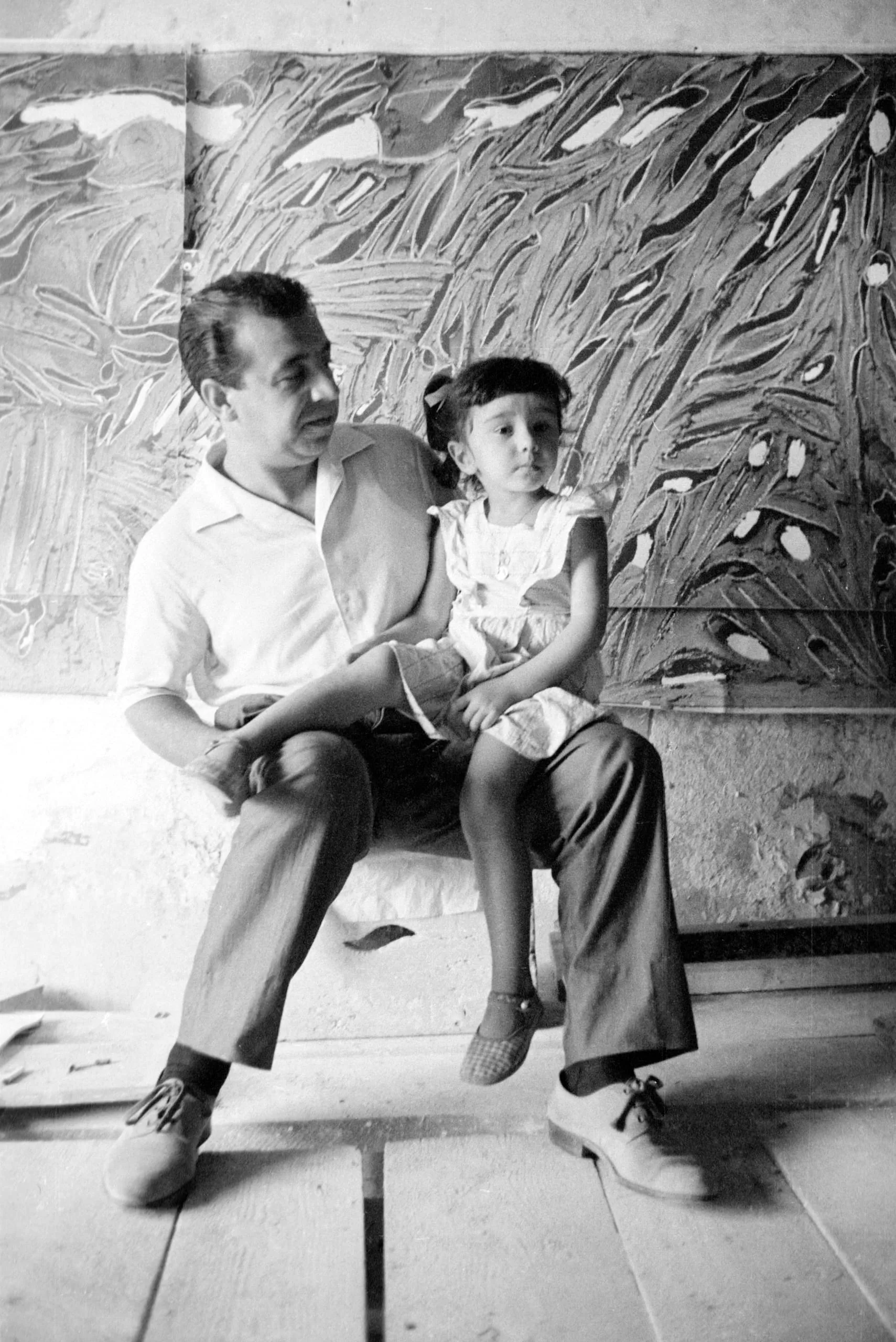Black and white photograph of a man and a young girl seated on a low platform in front of a large abstract painting with thick, swirling brushwork