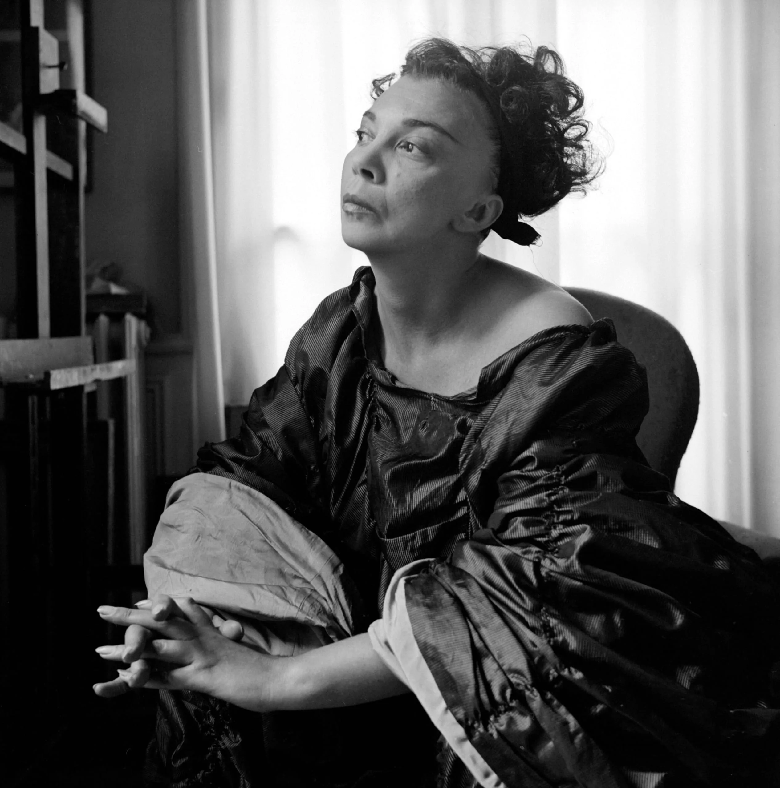 Black and white portrait photograph, a Black woman seated in an upholstered chair, wearing an off-the-shoulder silk garment, hands clasped in lap, gazing upward to the right, softly lit by a curtained window