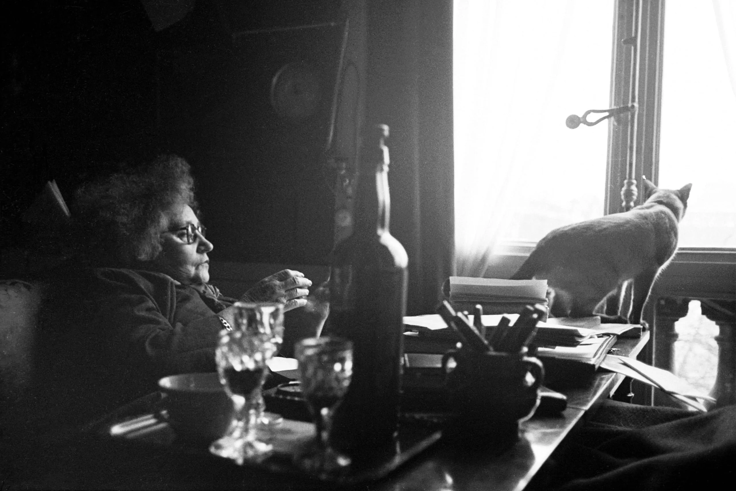 Black and white photograph, older woman with curly hair and glasses seated at a cluttered table looking toward a pale cat perched on the far edge, bright window behind