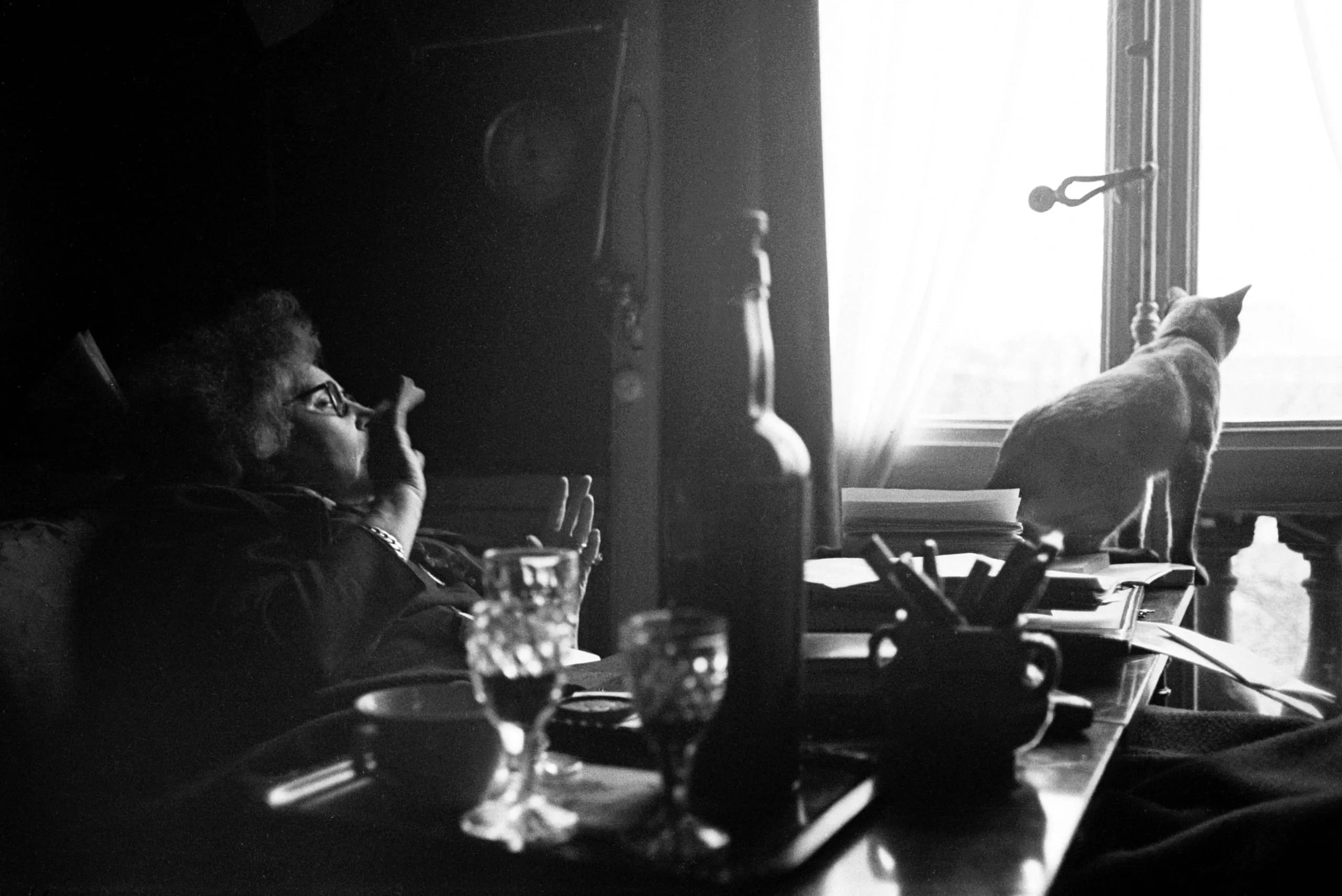 Black and white photograph of a person reclining in a chair at a cluttered table, lit from a bright window where a pale cat stands, high-contrast interior lighting