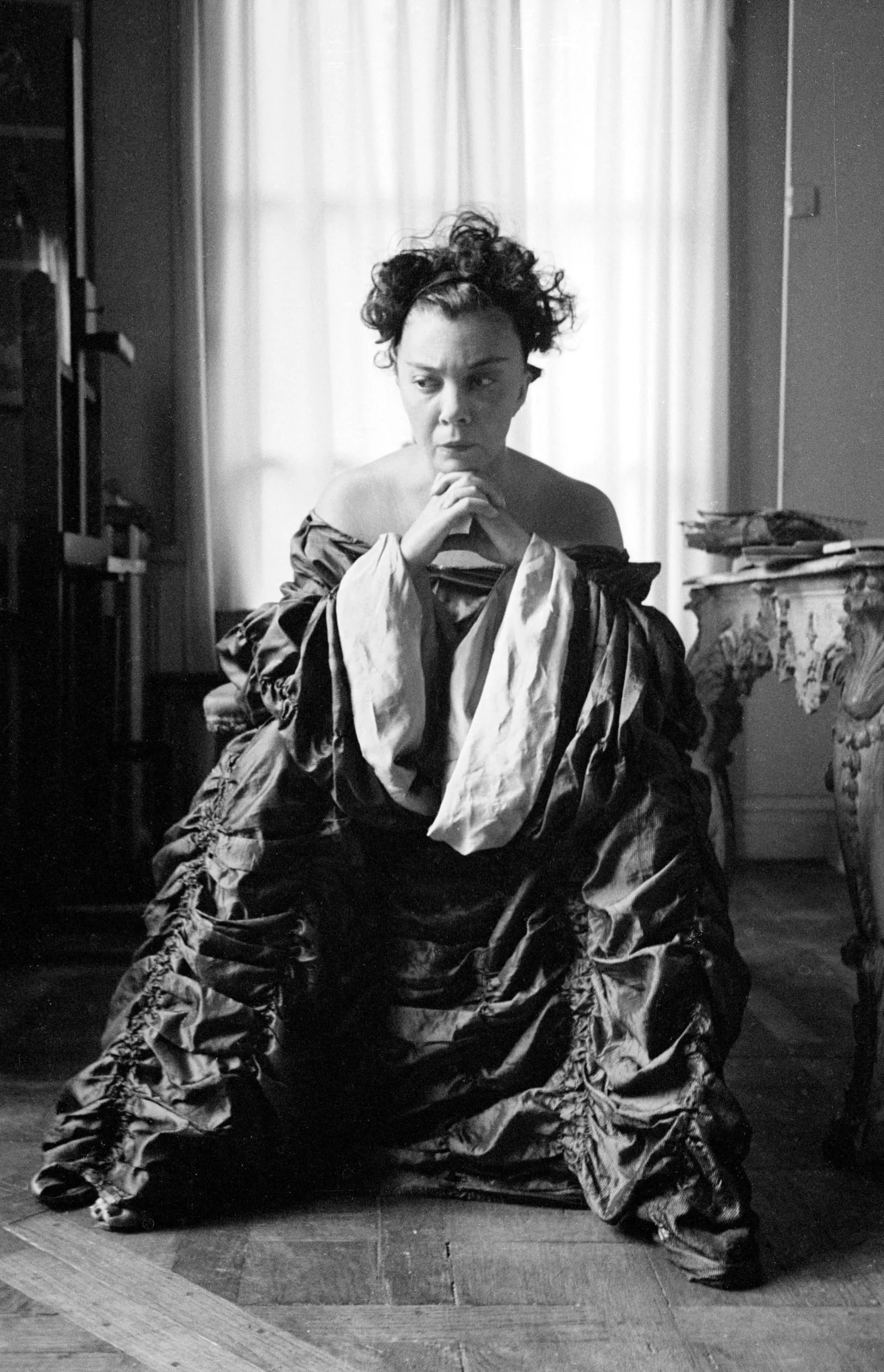Black and white photograph, full-length portrait of a woman seated on a parquet floor in a voluminous off-the-shoulder satin gown, hands clasped at her chin, backlit by a curtained window