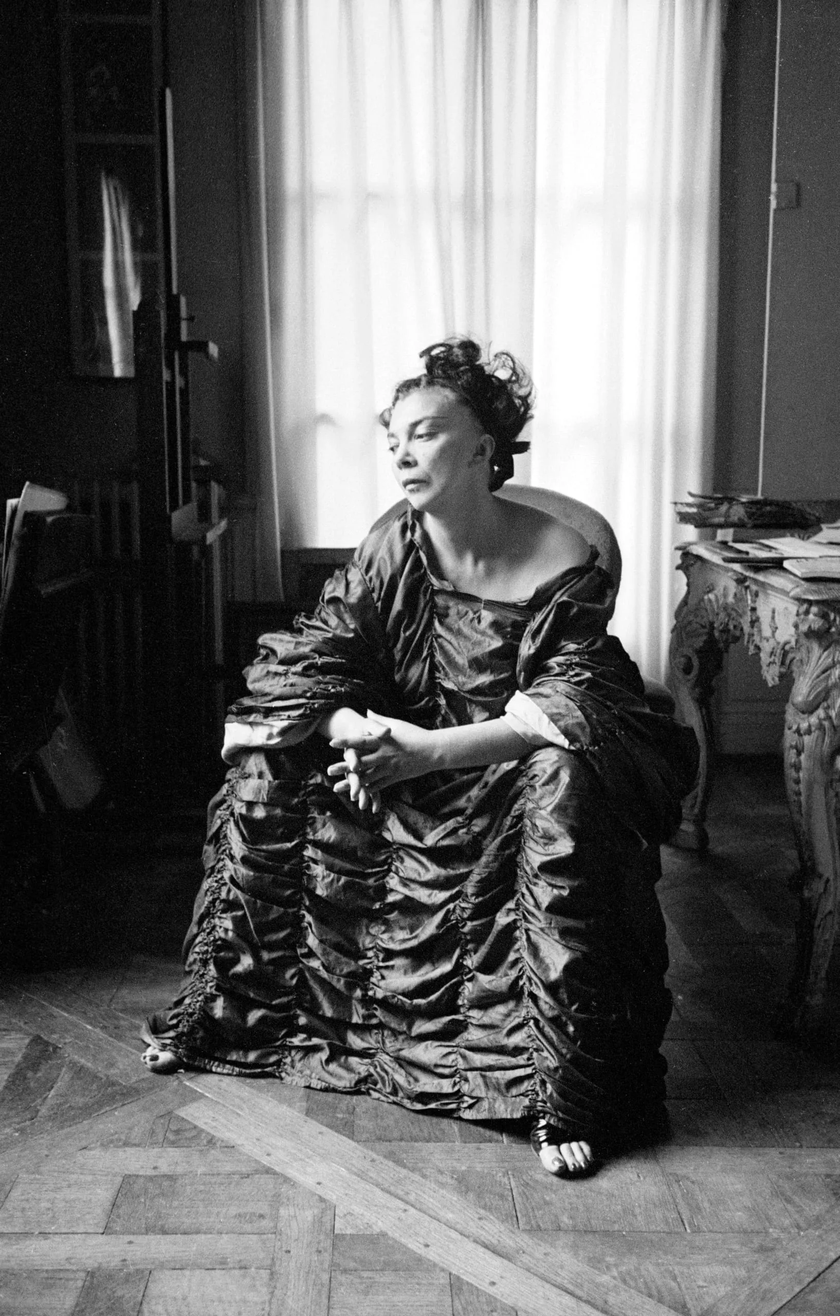 Black and white photograph of a woman in a voluminous ruched off-the-shoulder gown seated before a bright window, her hair pinned up, hands clasped in her lap