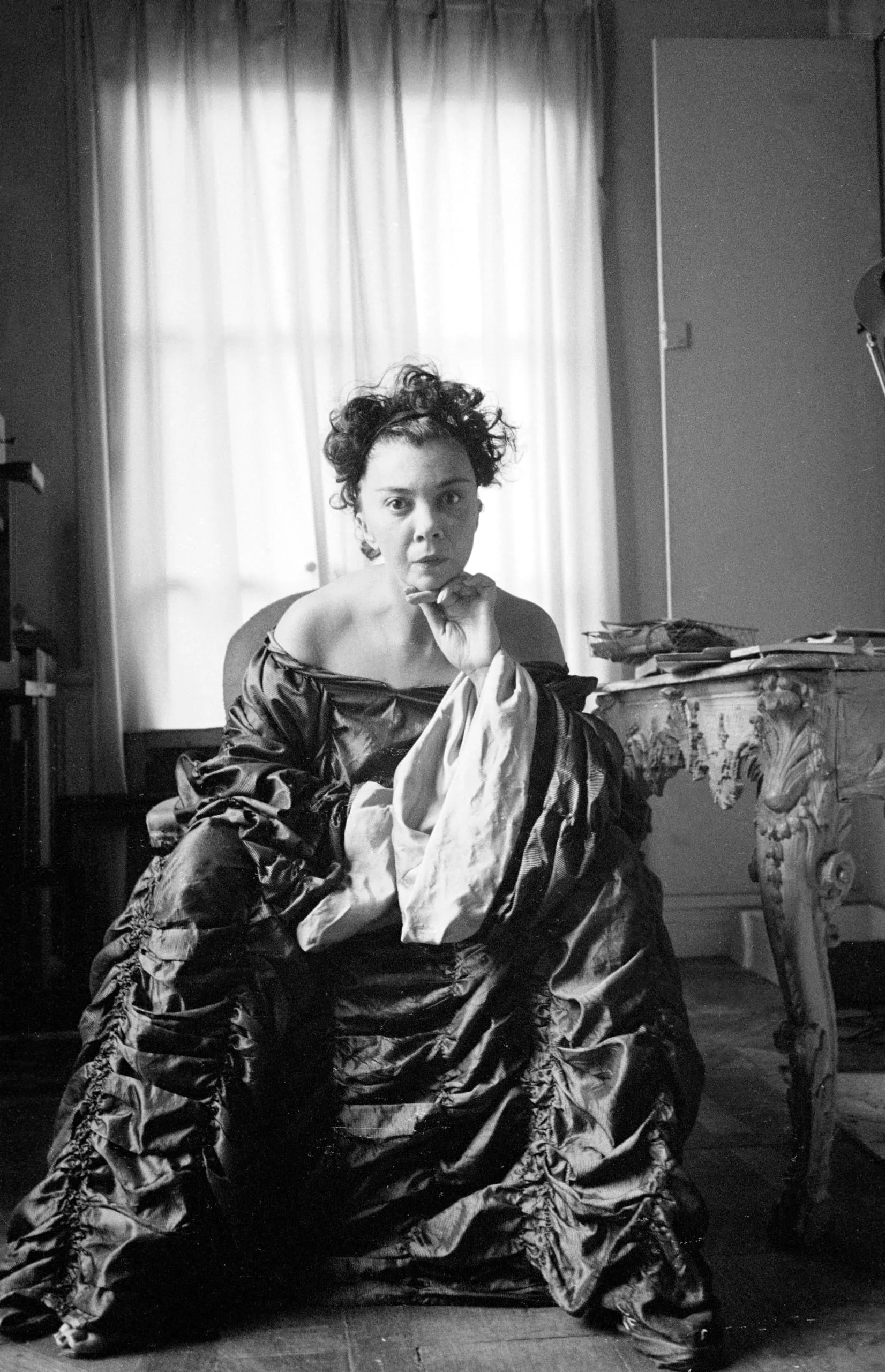 Black and white portrait photograph, a pale-skinned woman in an off-the-shoulder silk gown seated facing the camera, backlit by a curtained window