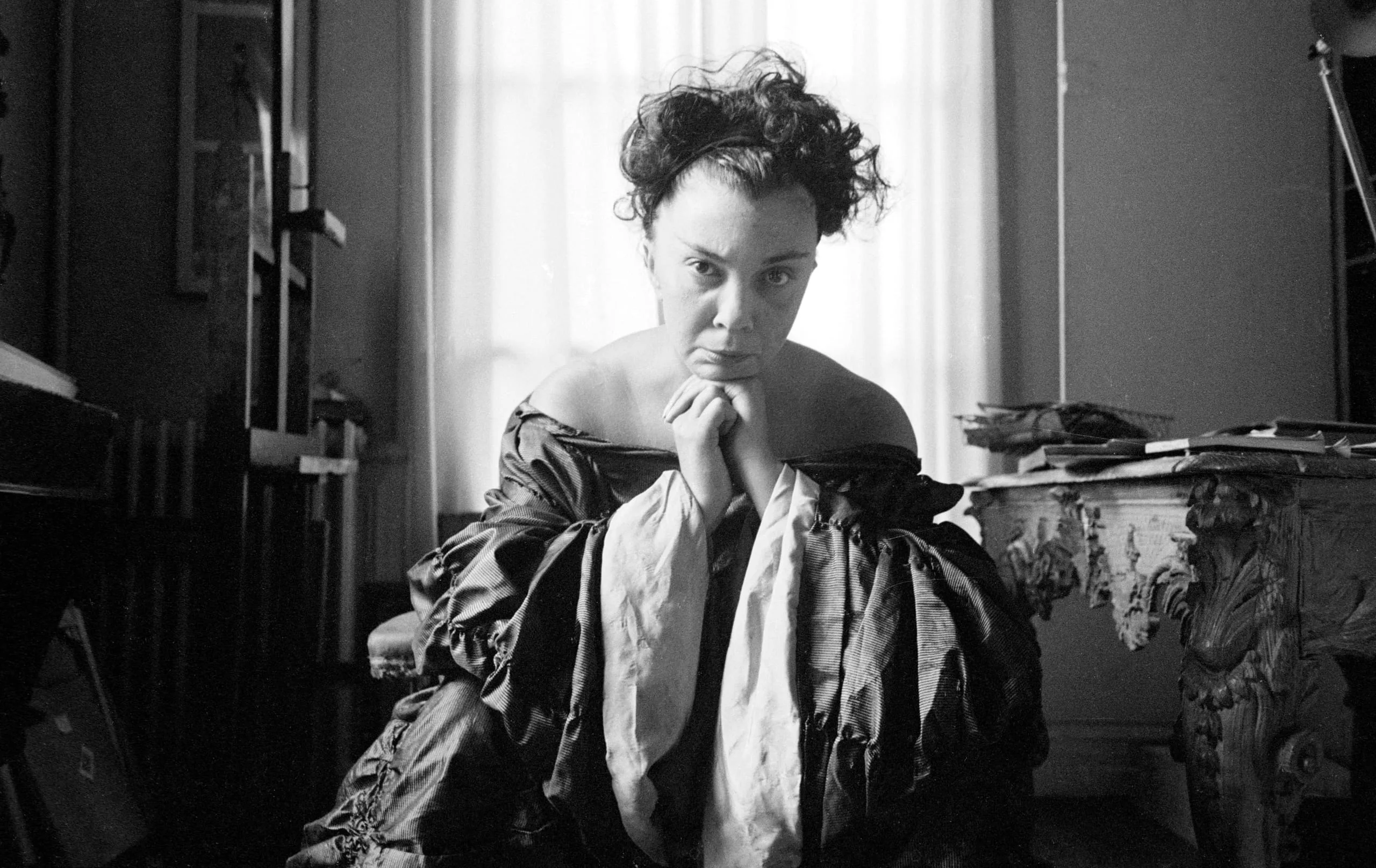 Black and white photograph, a woman seated and facing the camera, chin resting on hand, wearing an off-shoulder historical-style costume with voluminous sleeves, lit by a window behind her