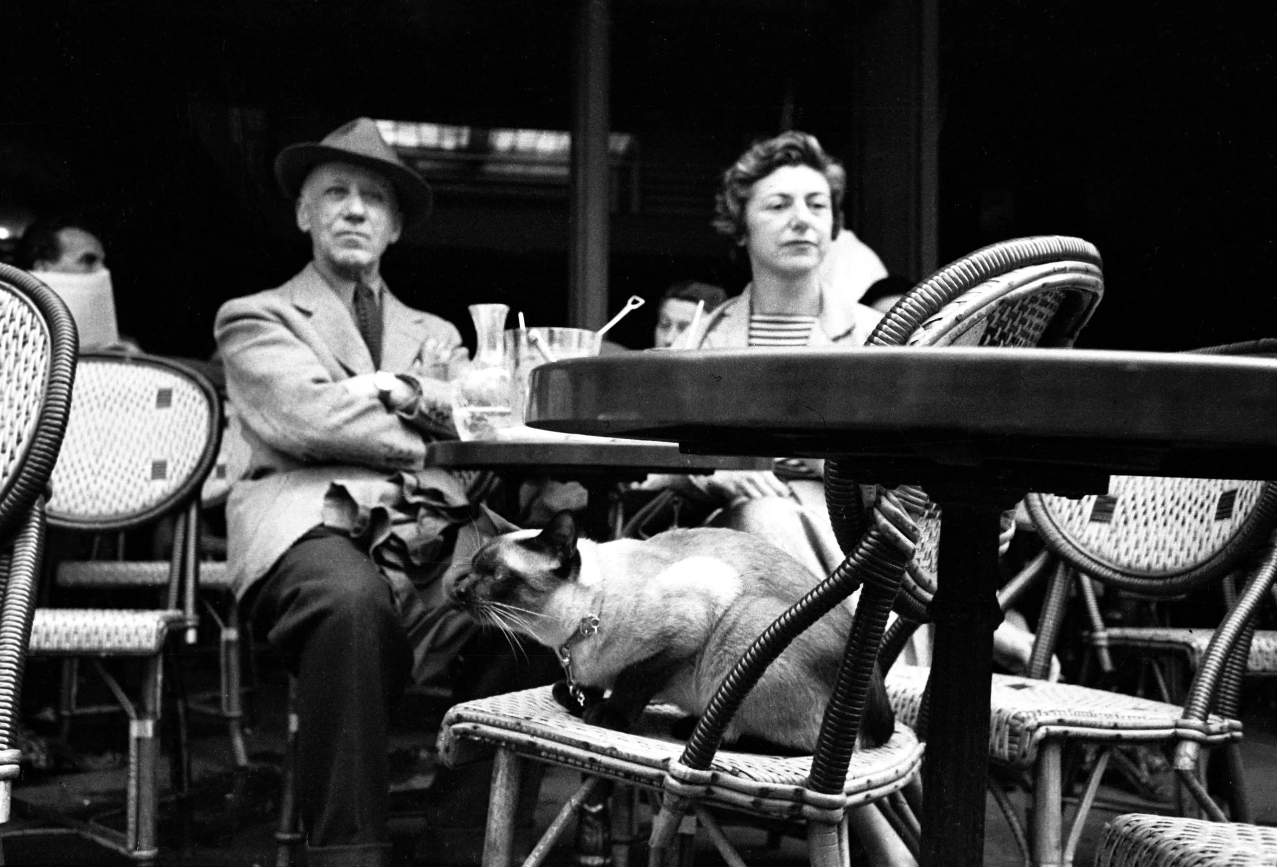 Black and white photograph of a café terrace, with a Siamese cat crouching on a wicker chair in the foreground and two adults seated at tables behind it