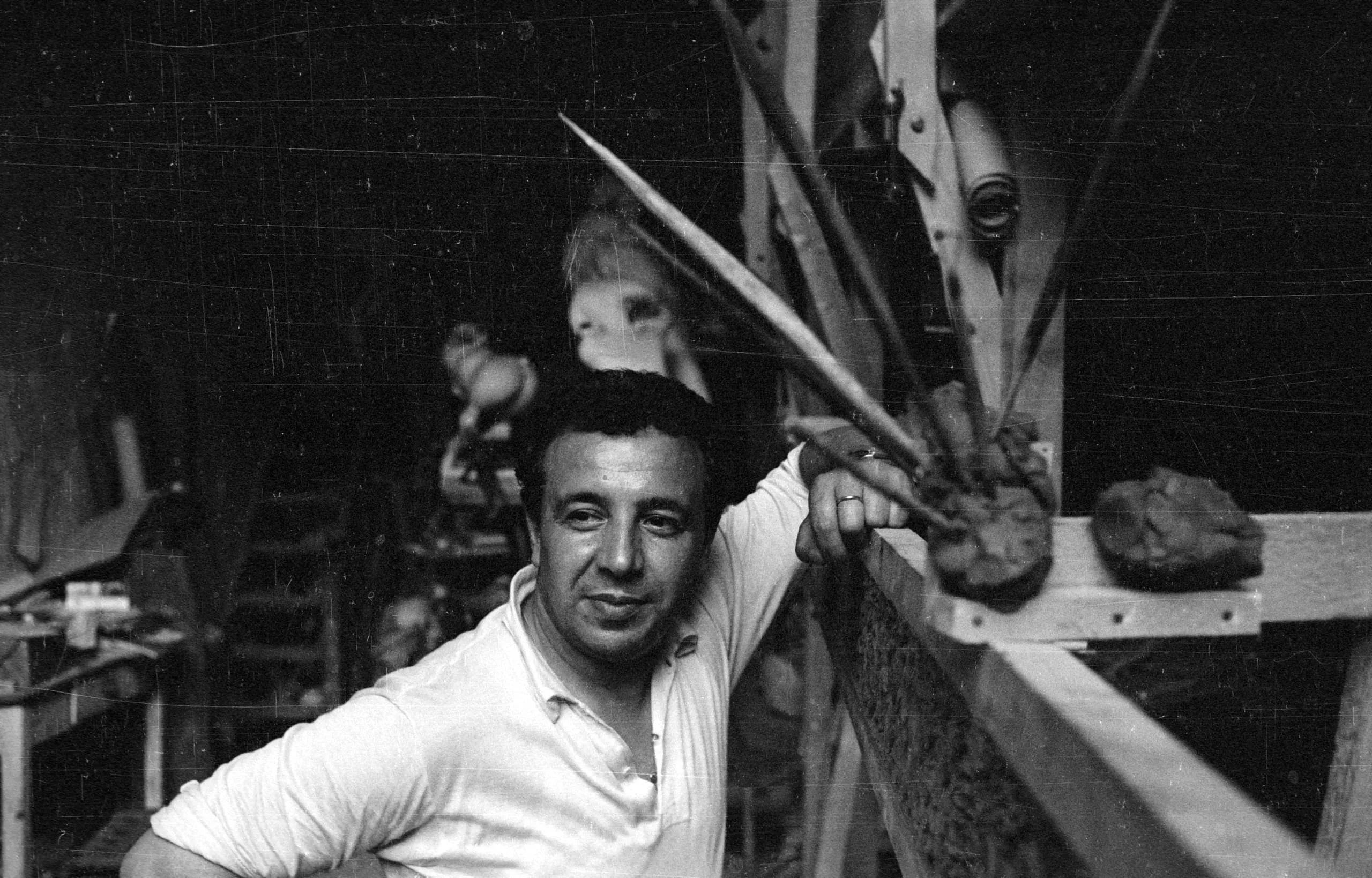 Black and white photograph of a man leaning against a wooden sculpting armature in a studio, with clay forms and works in progress visible in the background