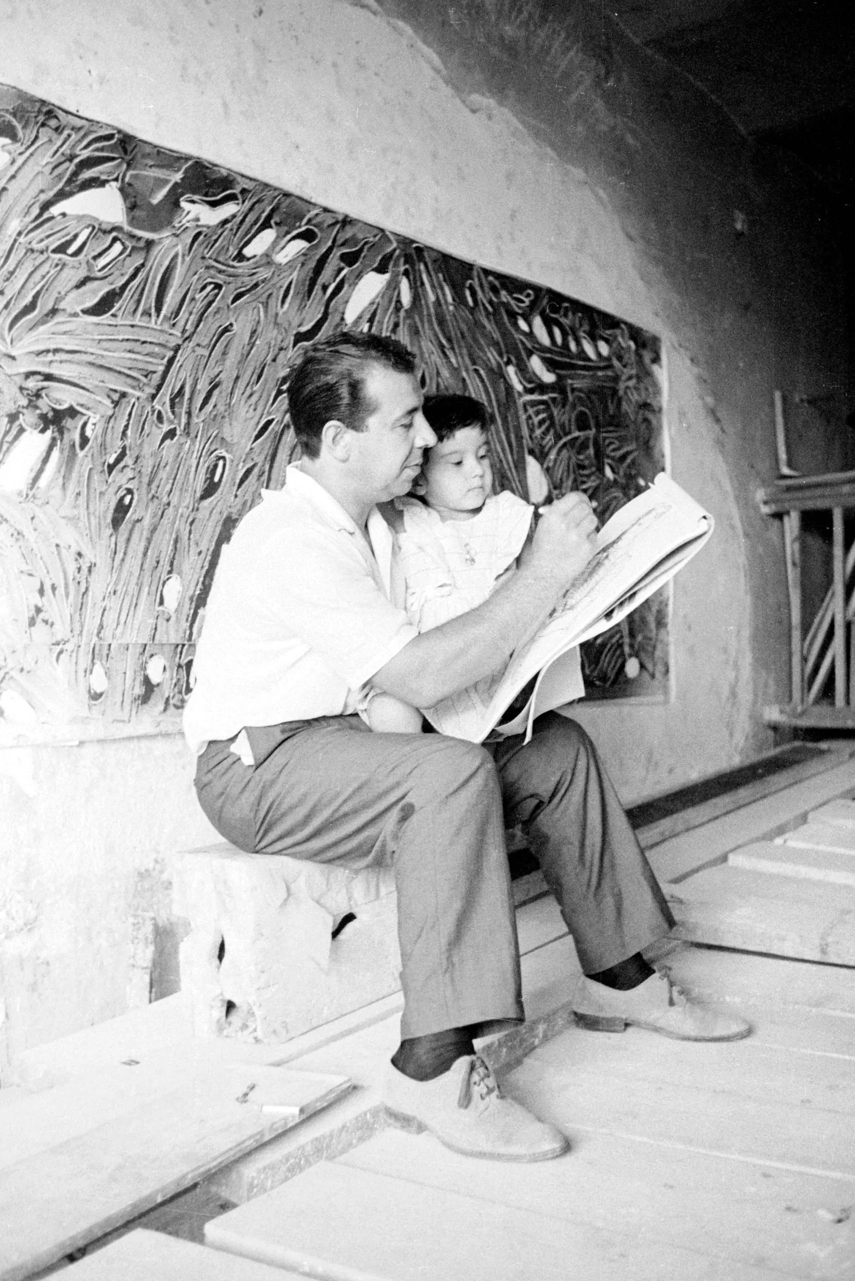 Black and white photograph of a man seated on a stone ledge, holding a child on his lap as both look at an open book, with a large carved relief panel on the wall behind them