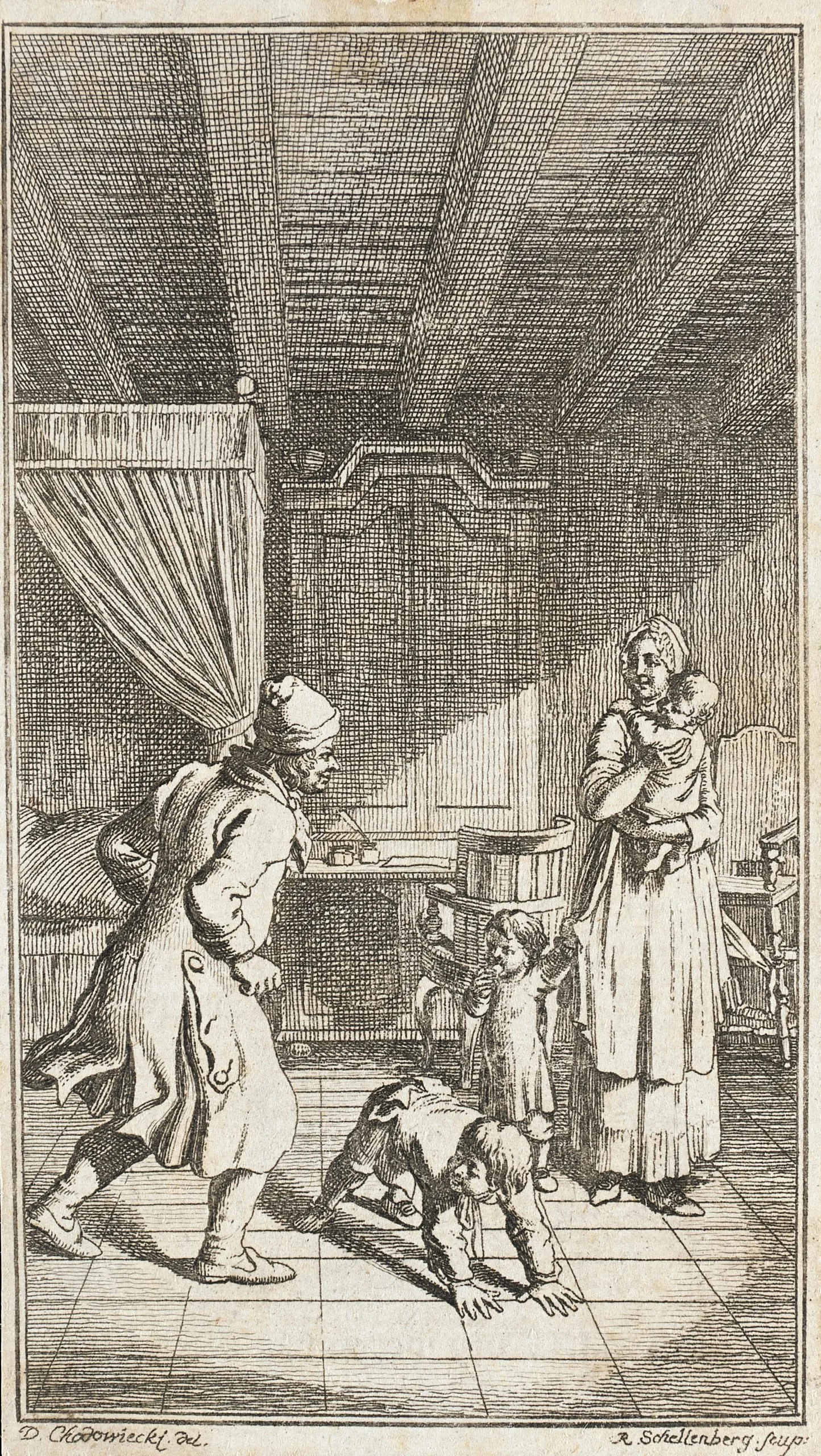 Engraving of a modest interior with a stout man carrying a bundle approaching a woman holding an infant, with two small children between them
