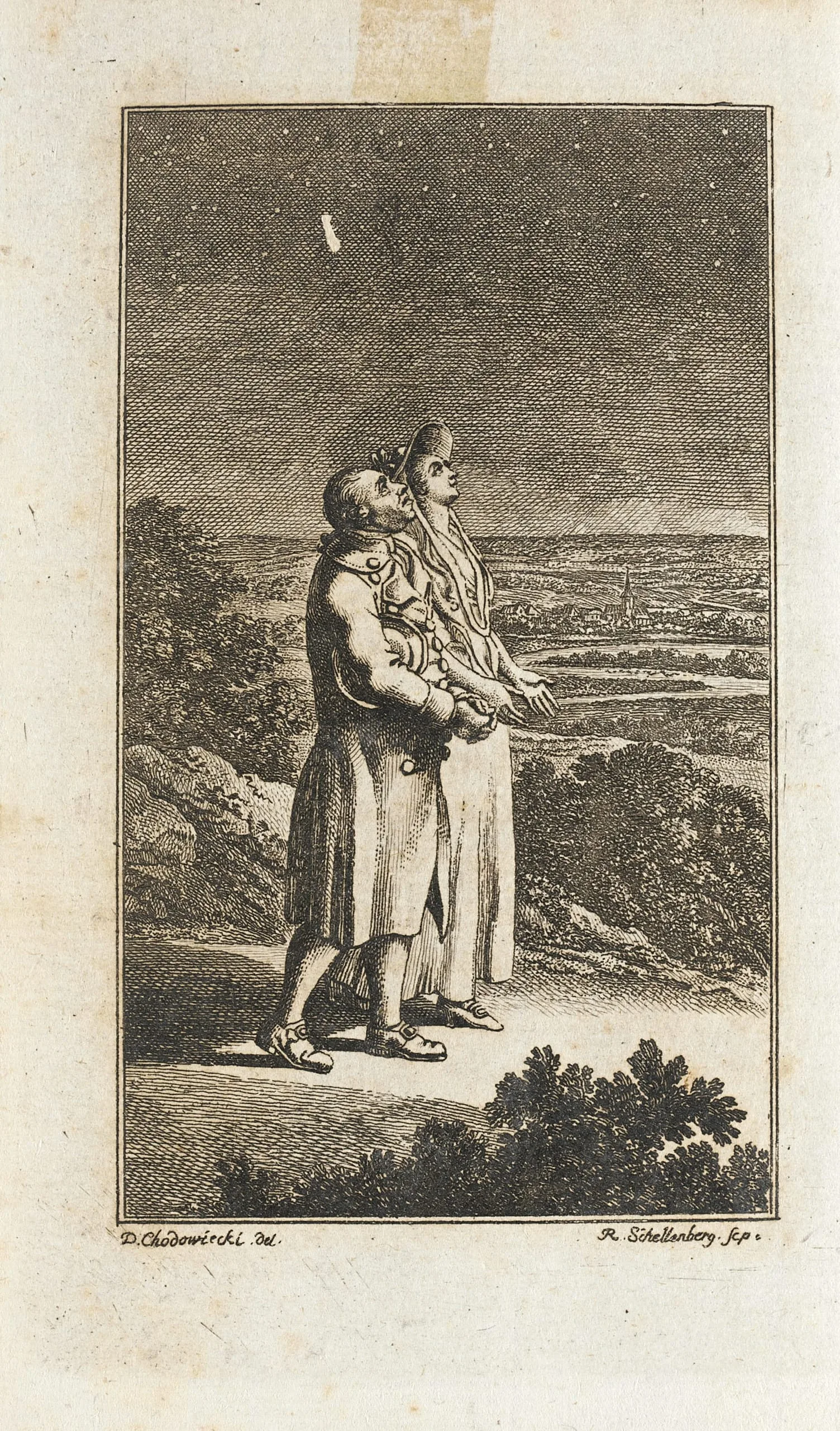 Engraving of two figures standing on an elevated outcrop gazing upward at a comet in a starry night sky, with a panoramic landscape and town in the distance; fine crosshatched linework.