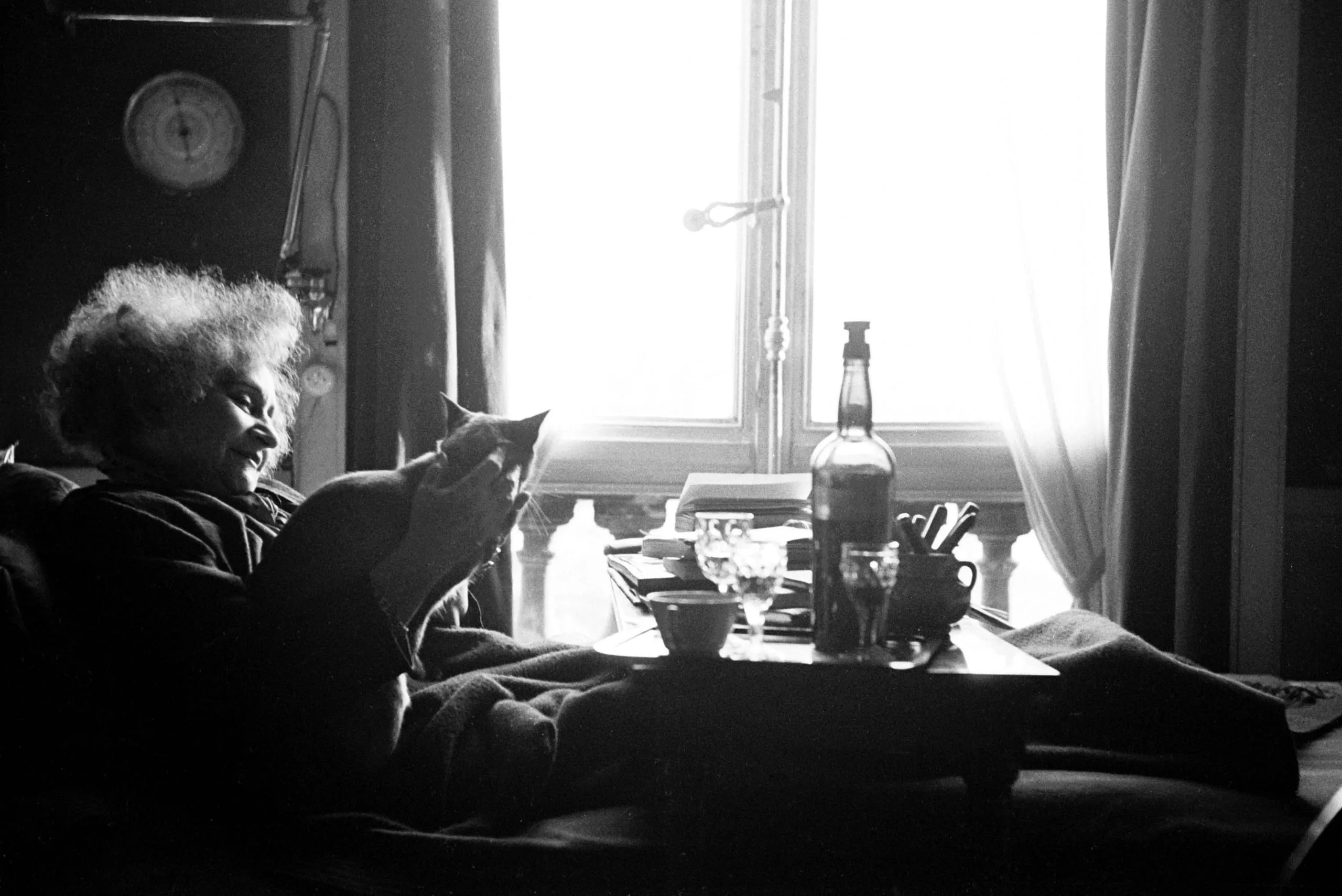 Black and white photograph of a person with curly white hair reclining in a chair, holding a dark cat up to their face, backlit by a bright window