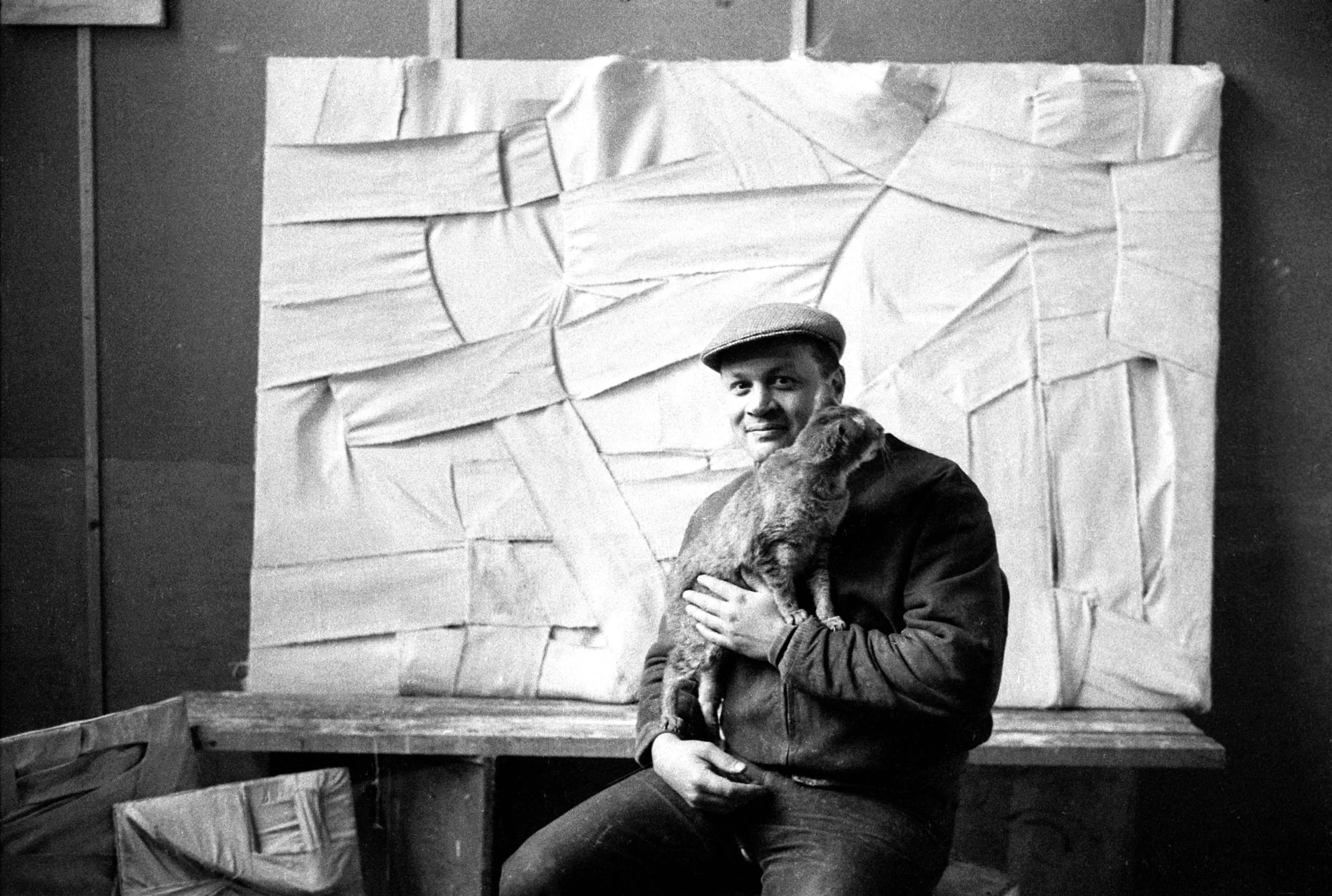 Black and white photograph of a smiling Black man in a flat cap seated in a studio, holding a cat, with a large textured canvas on an easel behind him