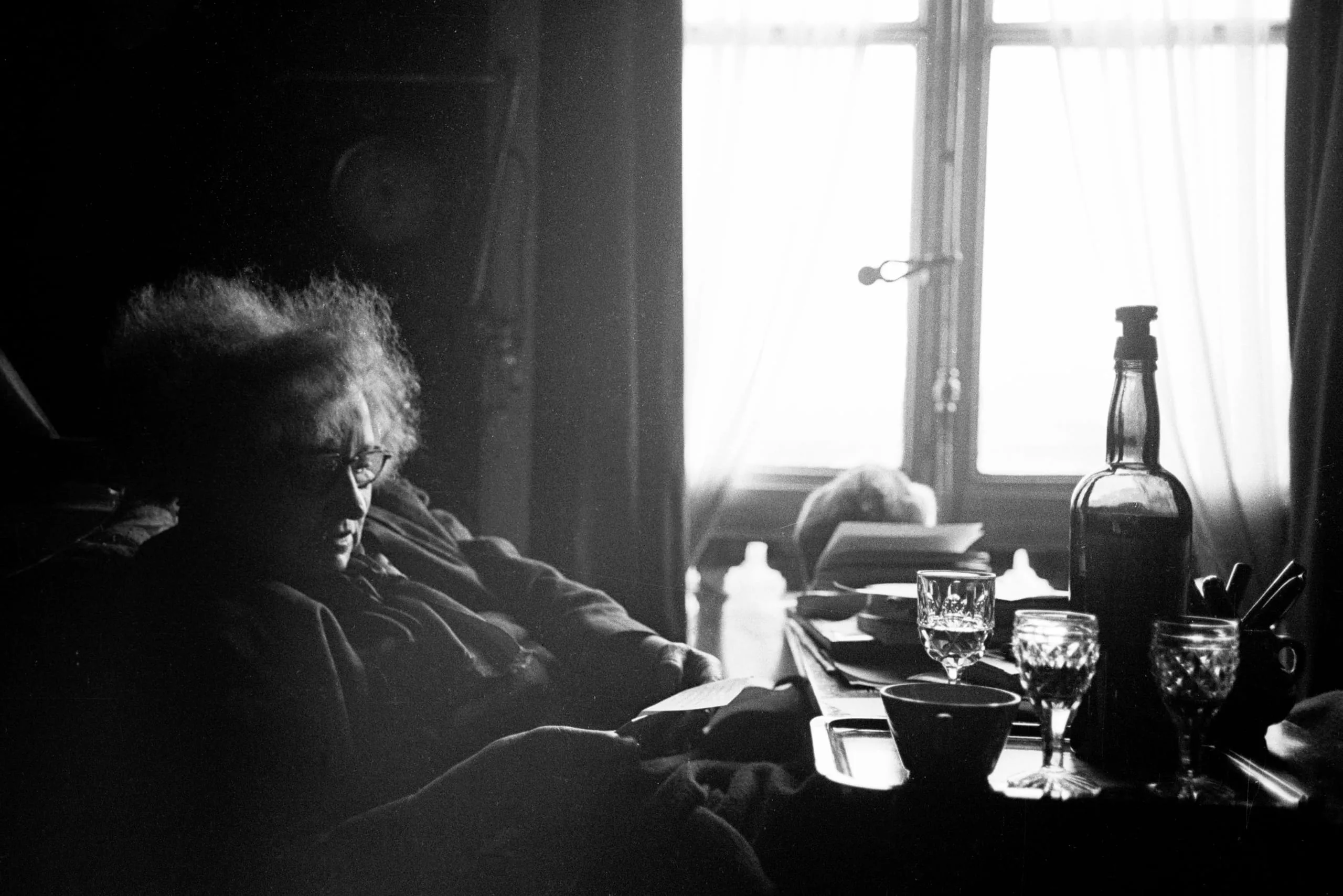 Black and white photograph of an older person with wild gray hair seated at a table near a bright window, face in deep shadow, with glass bottles and cut-crystal glasses in the foreground