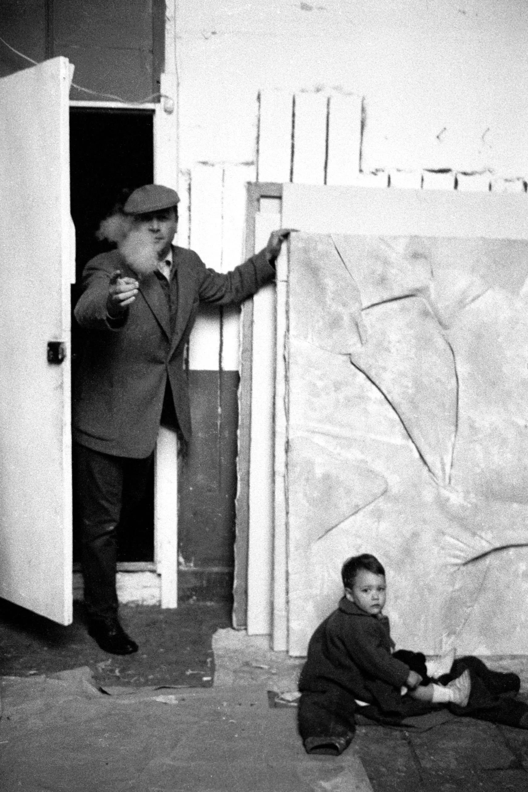 Black and white photograph of an older bearded man in a flat cap standing beside a large abstract plaster relief panel, with a young child seated on the ground nearby