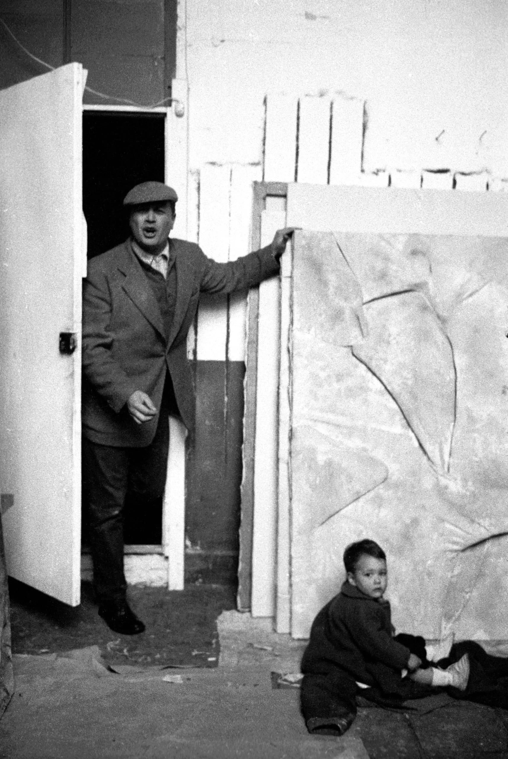Black and white photograph of a man in a flat cap and dark jacket standing in a doorway beside a large plaster relief panel, with a young child seated on the floor nearby