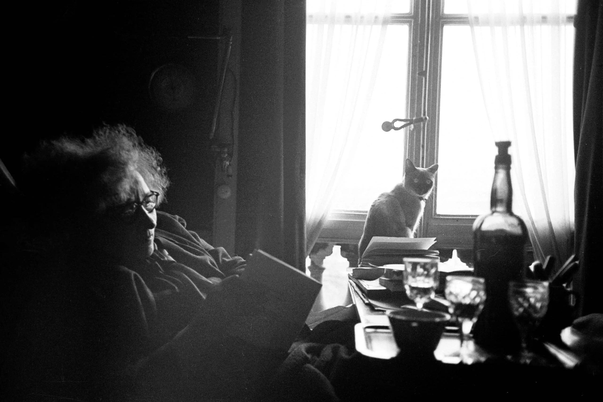 Black and white photograph of a person with curly hair and glasses reading at a table, backlit by a bright window, with a cat sitting on the table nearby