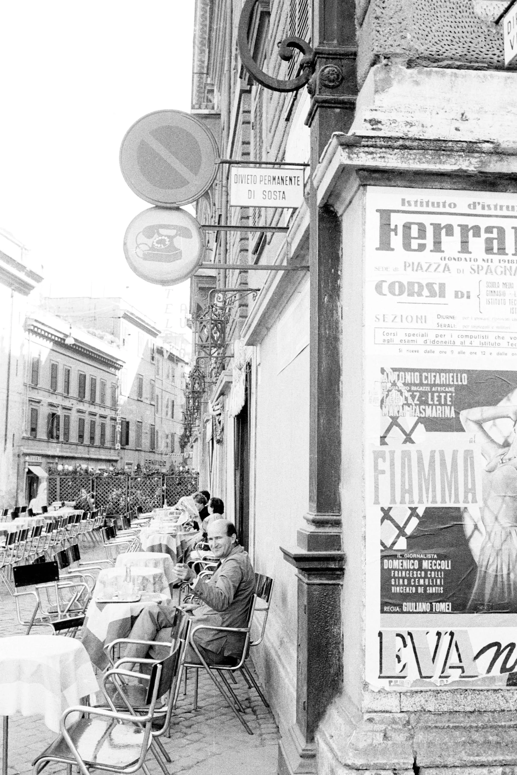 Black and white photograph of a Roman street corner with an outdoor café, road signs, and Italian film and language school posters on a peeling plaster wall