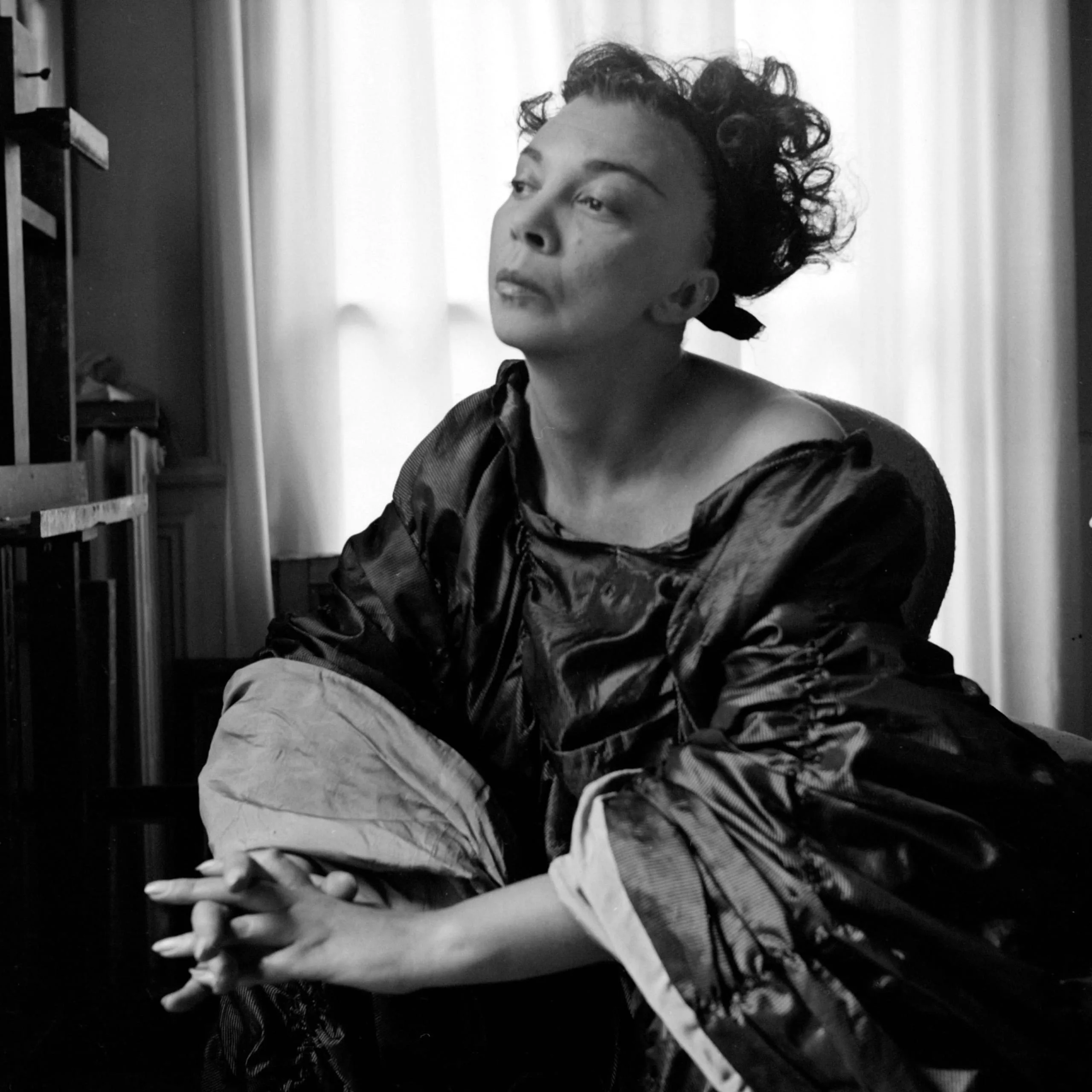 Black and white photograph of a seated Black woman in a shiny off-the-shoulder gown, head tilted upward, soft light from a curtained window behind her