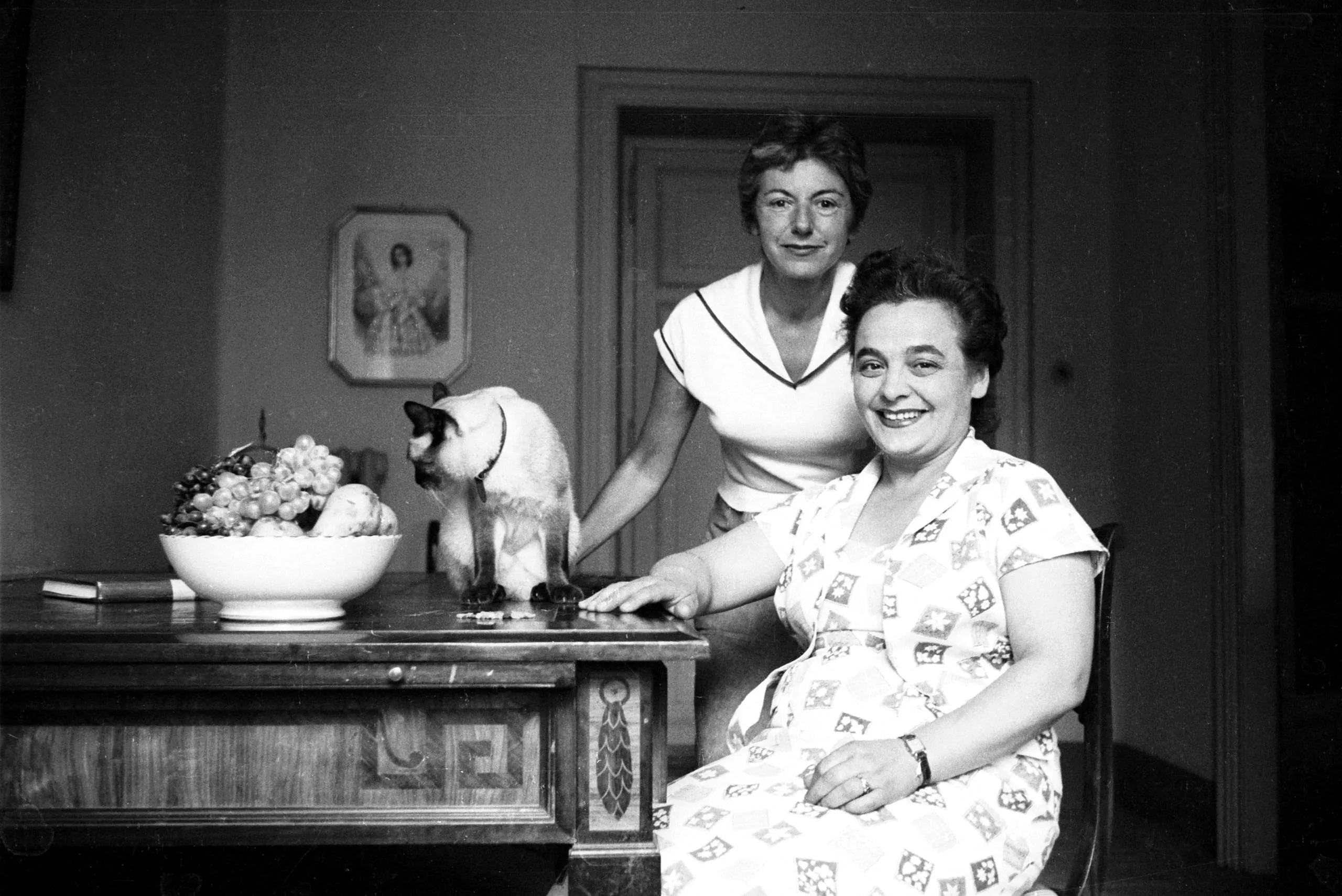 Black and white photograph of two women and a Siamese cat at a wooden table in a home interior, with a fruit bowl nearby