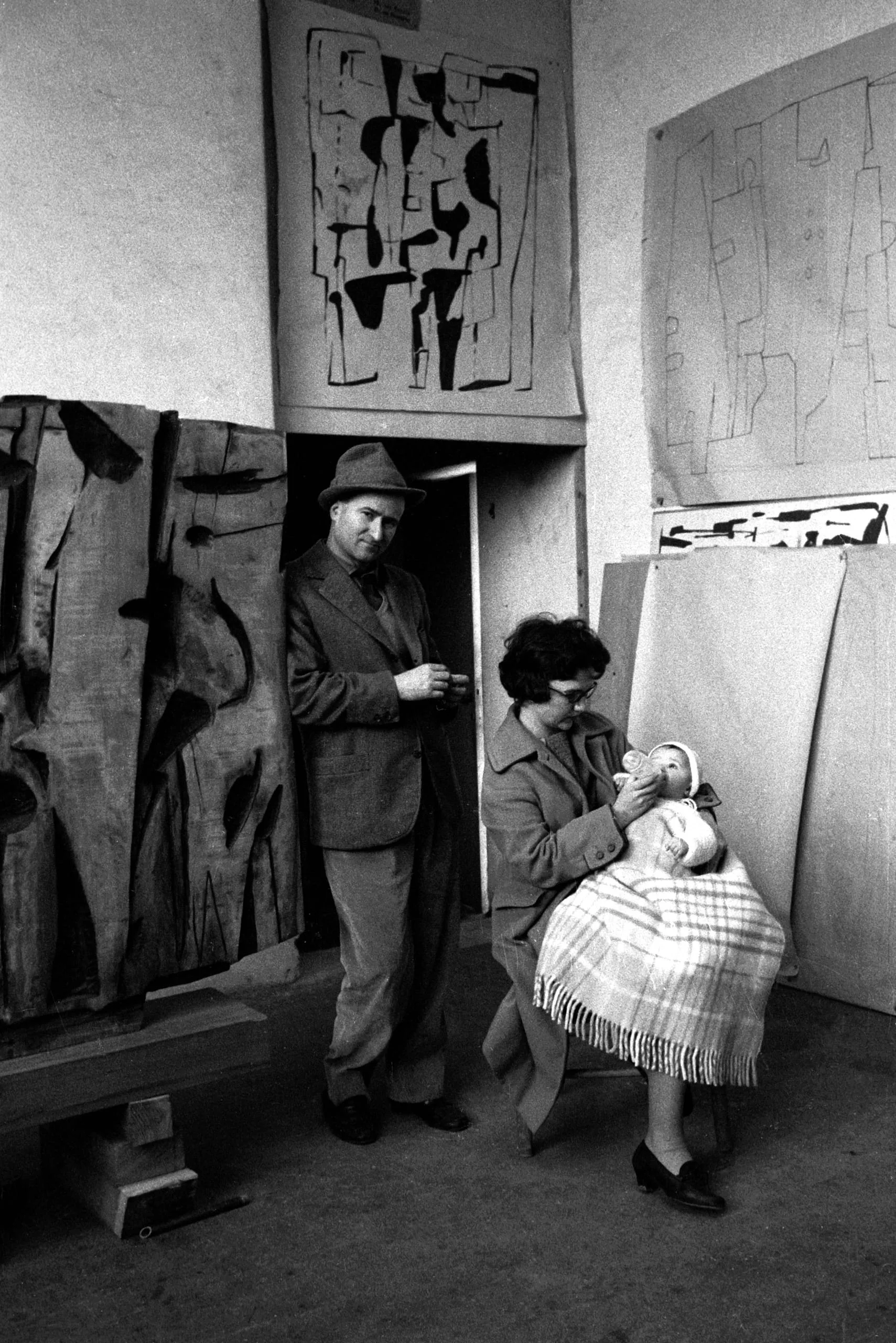 Black and white photograph of a man and woman with an infant in an artist's studio, surrounded by large wooden relief sculptures and abstract works on paper