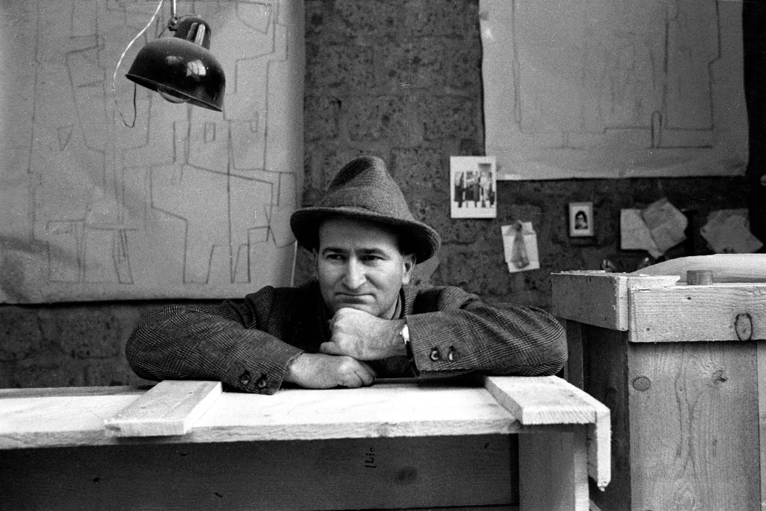 Black and white photograph of a man in a fedora and tweed jacket leaning on a wooden workbench, with gestural line drawings pinned to a brick wall behind him