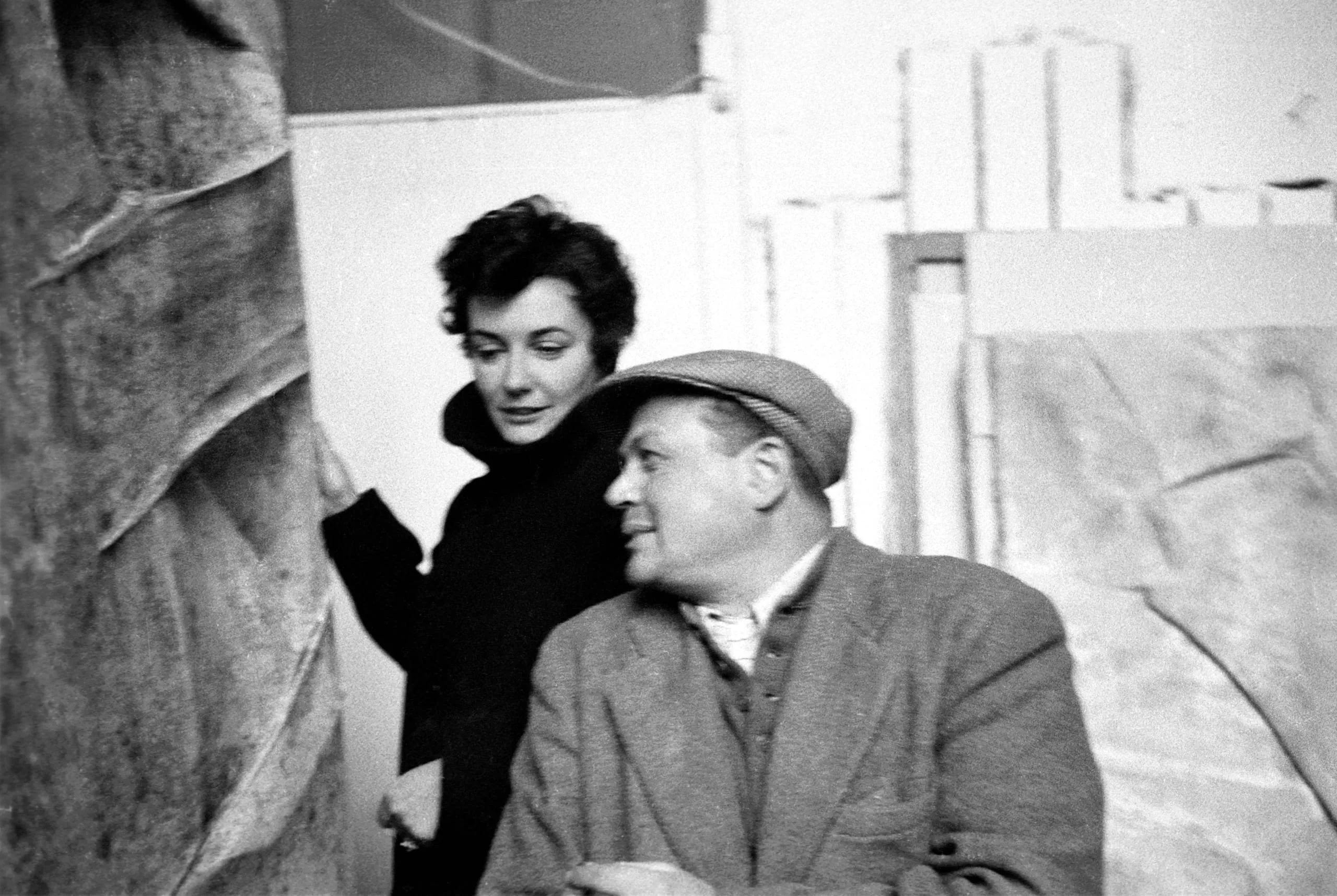 Black and white photograph of a woman and a seated man in an artist's studio, with a large textured sculptural form at left and canvases visible in the background