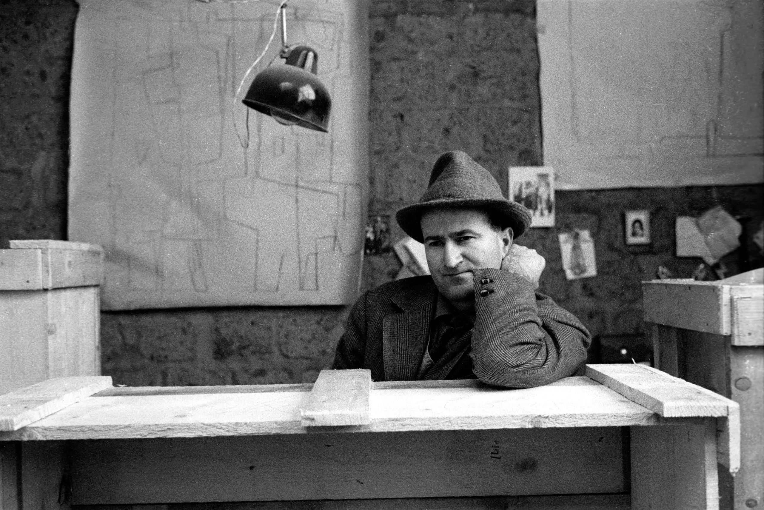 Black and white photograph of a white man in a felt hat and tweed jacket leaning on a wooden worktable in an artist's studio, geometric sketches pinned to the wall behind him