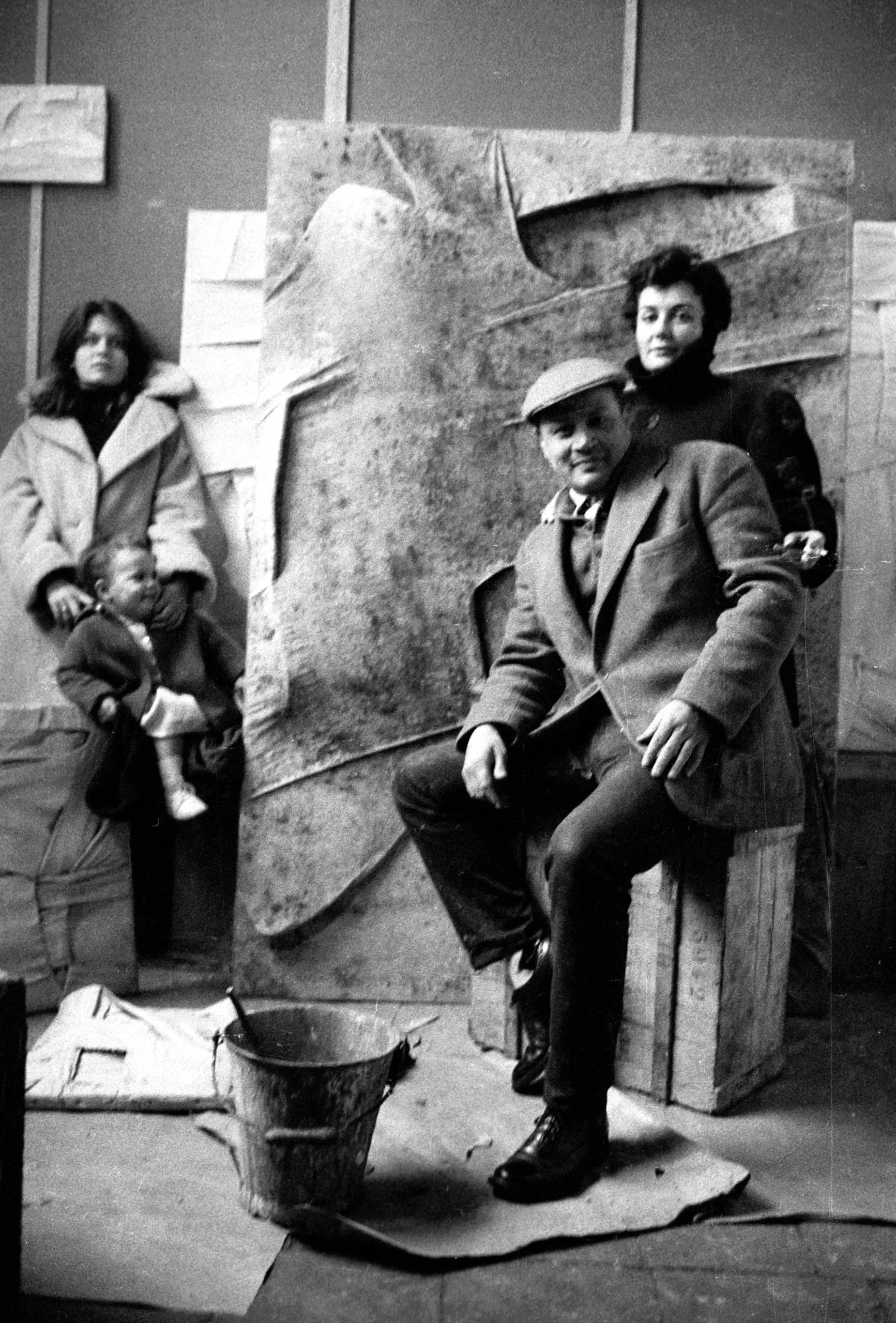 Black and white photograph of three adults and a toddler posed in a sculptor's studio around a large abstract plaster relief