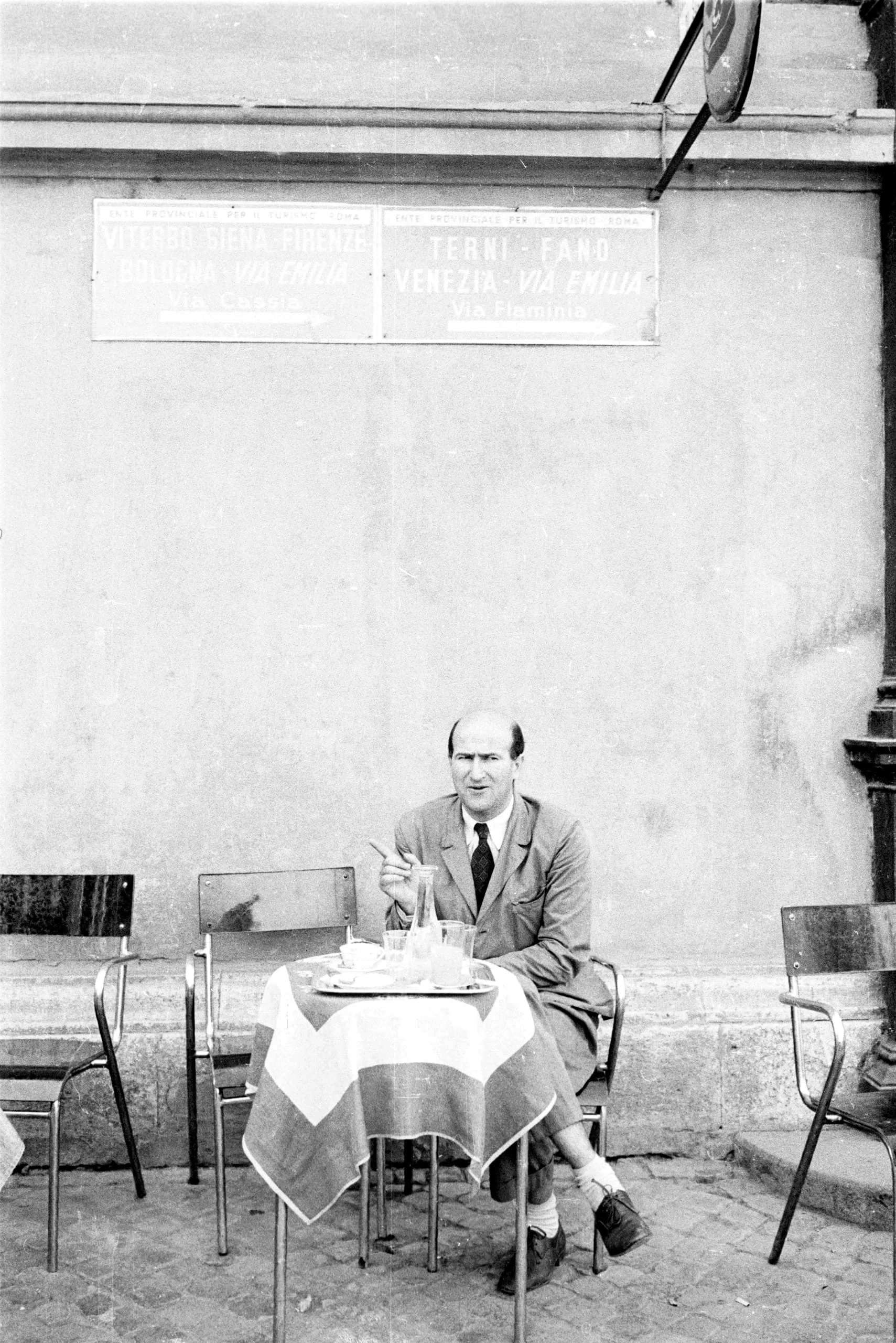 Black and white photograph of a man in a suit seated at an outdoor café table, gesturing with one raised finger, Italian street signs on a stucco wall behind him