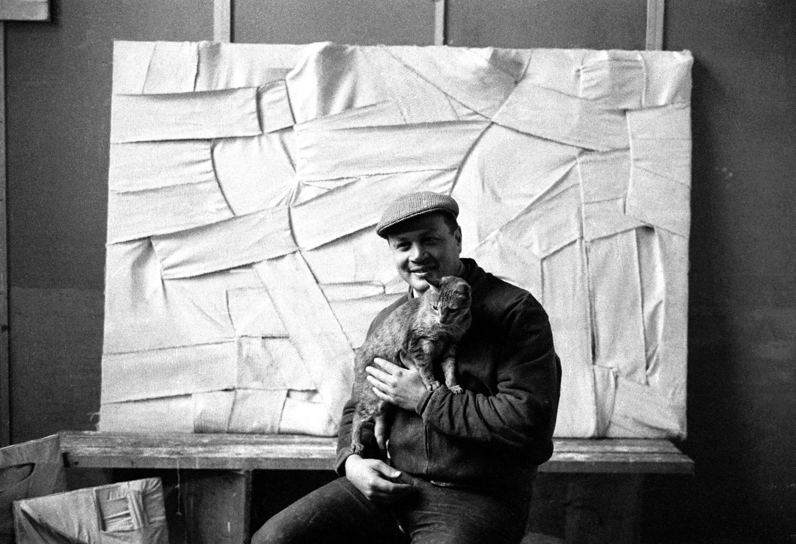 Black and white photograph of a man in a flat cap seated on a workbench holding a cat, an abstract textured canvas propped behind him