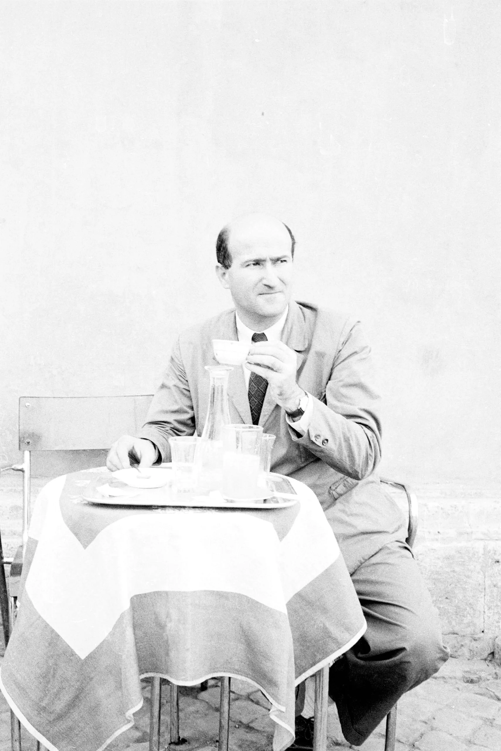 Black and white photograph of a bald white man in a suit holding a small cup at an outdoor café table with a water carafe and glasses