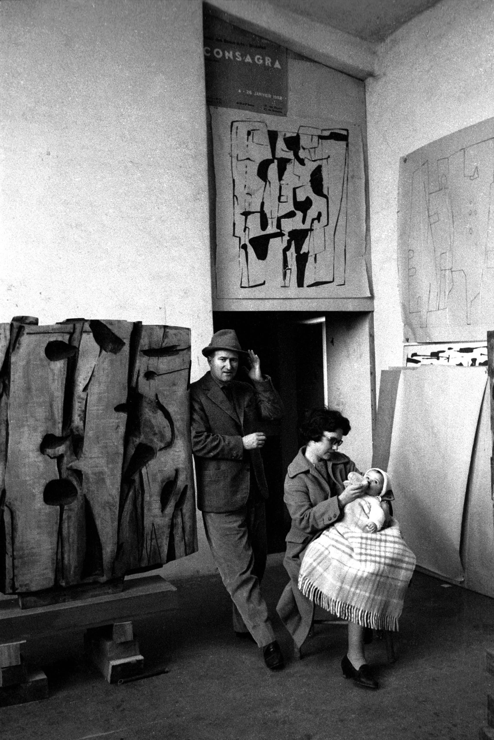 Black and white photograph of a man in a hat and suit standing beside large abstract wood sculptures in an artist's studio, with a seated woman holding an infant nearby
