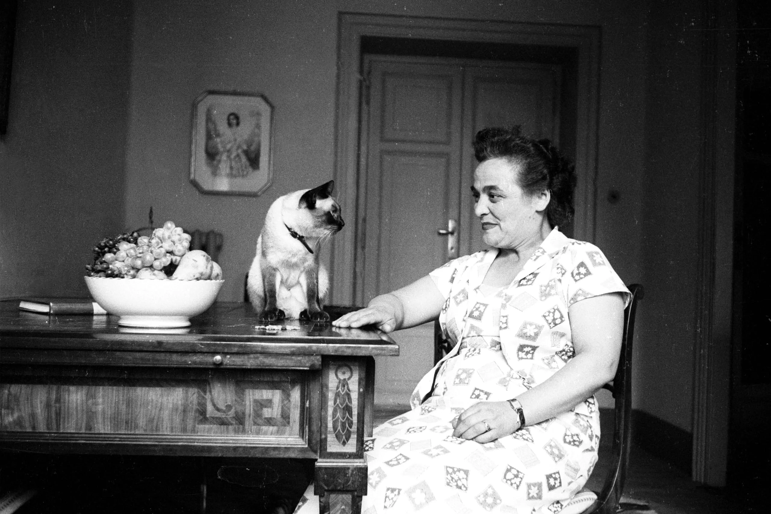 Black and white photograph of a woman seated at a wooden table, hand extended toward a Siamese cat sitting on the tabletop, with a fruit bowl nearby