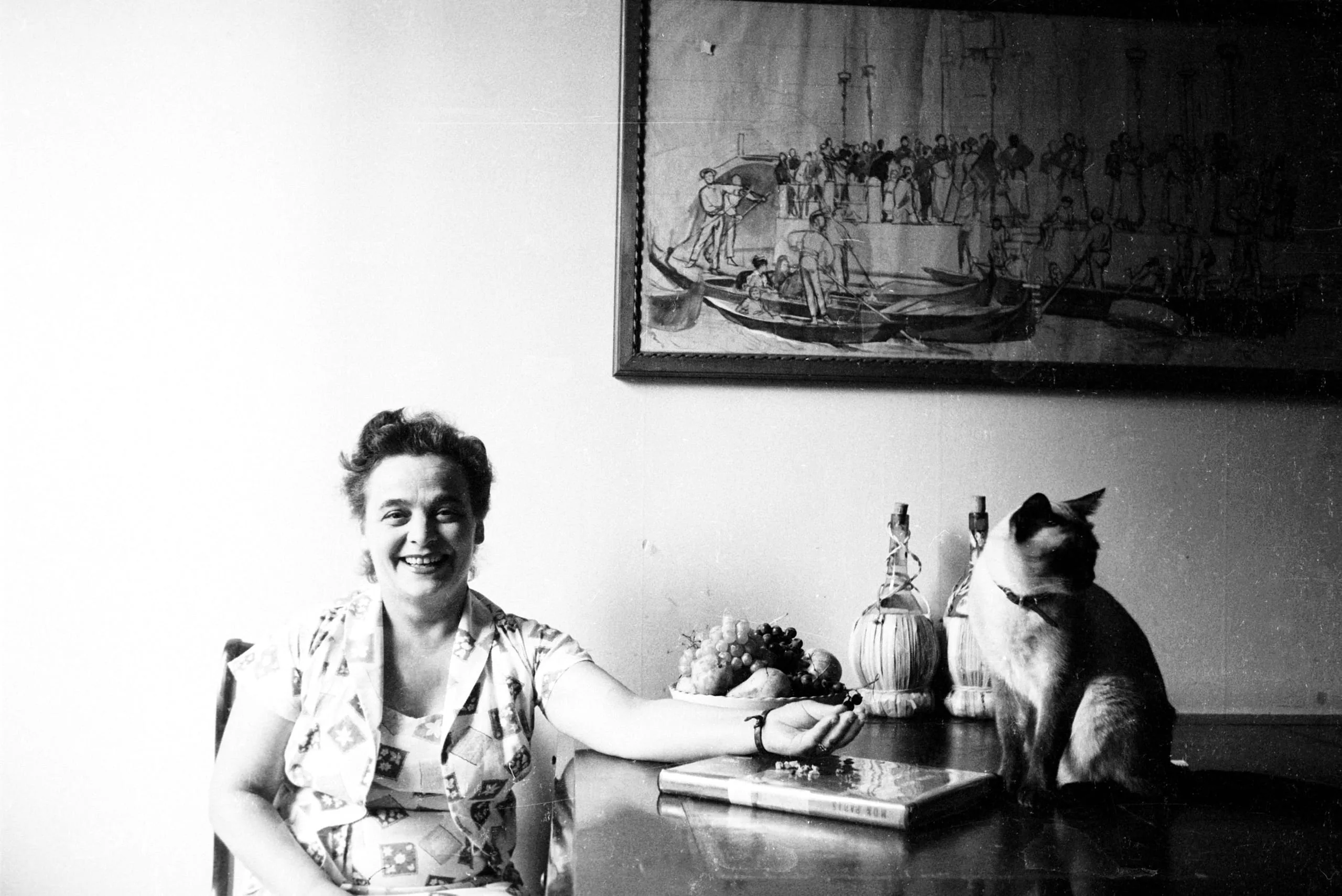 Black and white photograph of a smiling white woman seated at a table with a fruit bowl and a Siamese cat, a framed harbor scene painting on the wall behind her