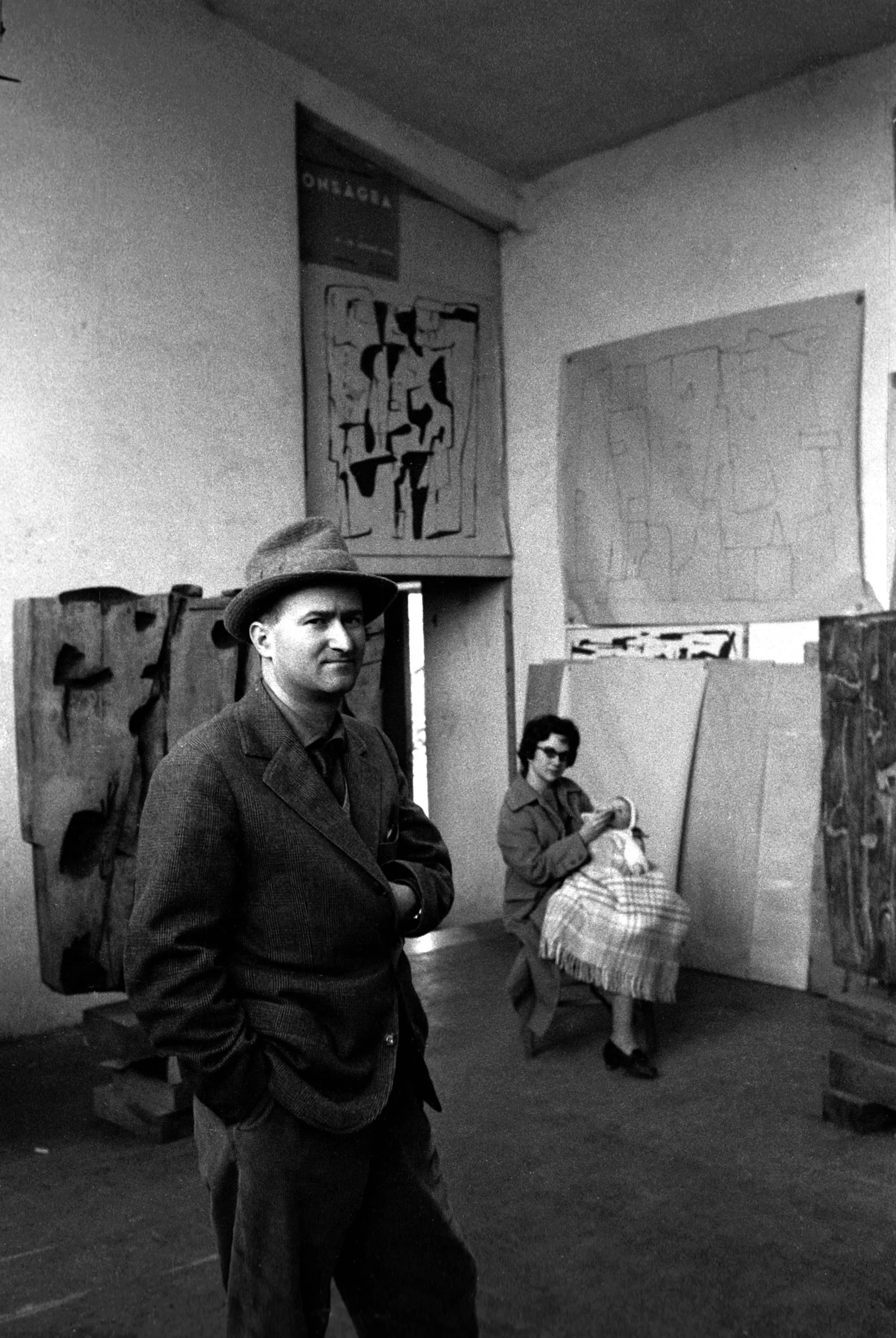 Black and white photograph of a man in a fedora and dark blazer standing in an artist's studio, with a seated woman and large abstract canvases visible behind him