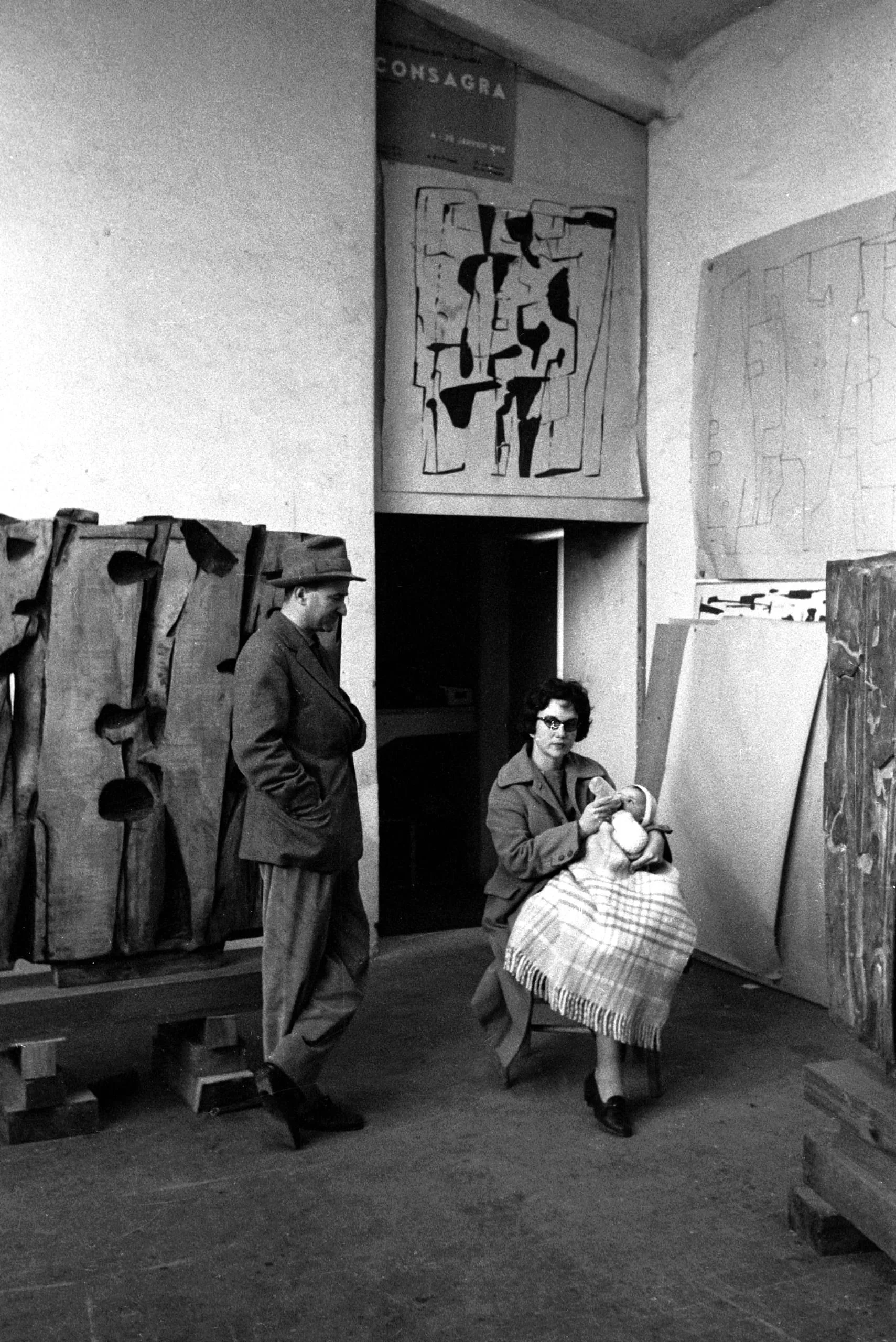 Black and white photograph of two adults and a child in an art gallery or studio, with large wood sculptures at left and a 'CONSAGRA' exhibition poster above a doorway