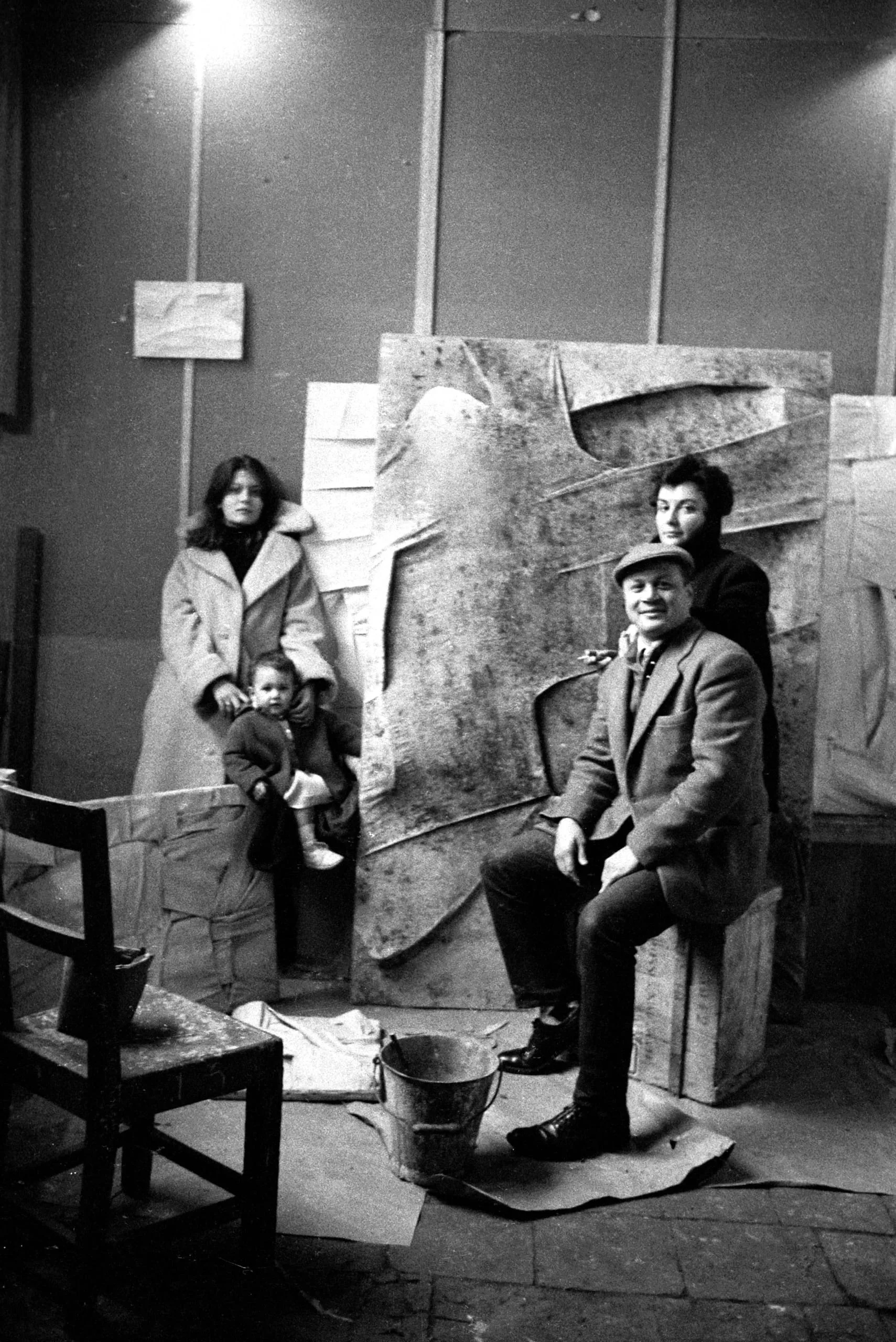 Black and white photograph of four people — a woman holding a toddler, a smiling seated man in a flat cap, and a younger figure — posed among large plaster relief sculptures in an artist's studio
