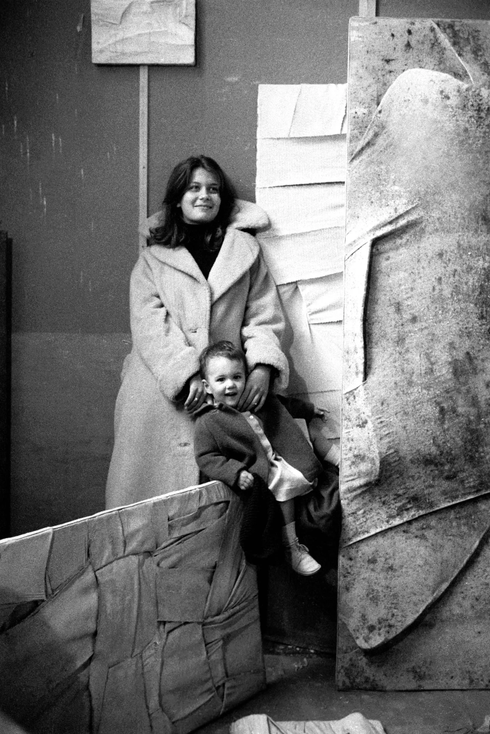 Black and white photograph of a smiling young woman in a heavy coat holding a toddler, surrounded by large plaster sculpture slabs in an artist's studio