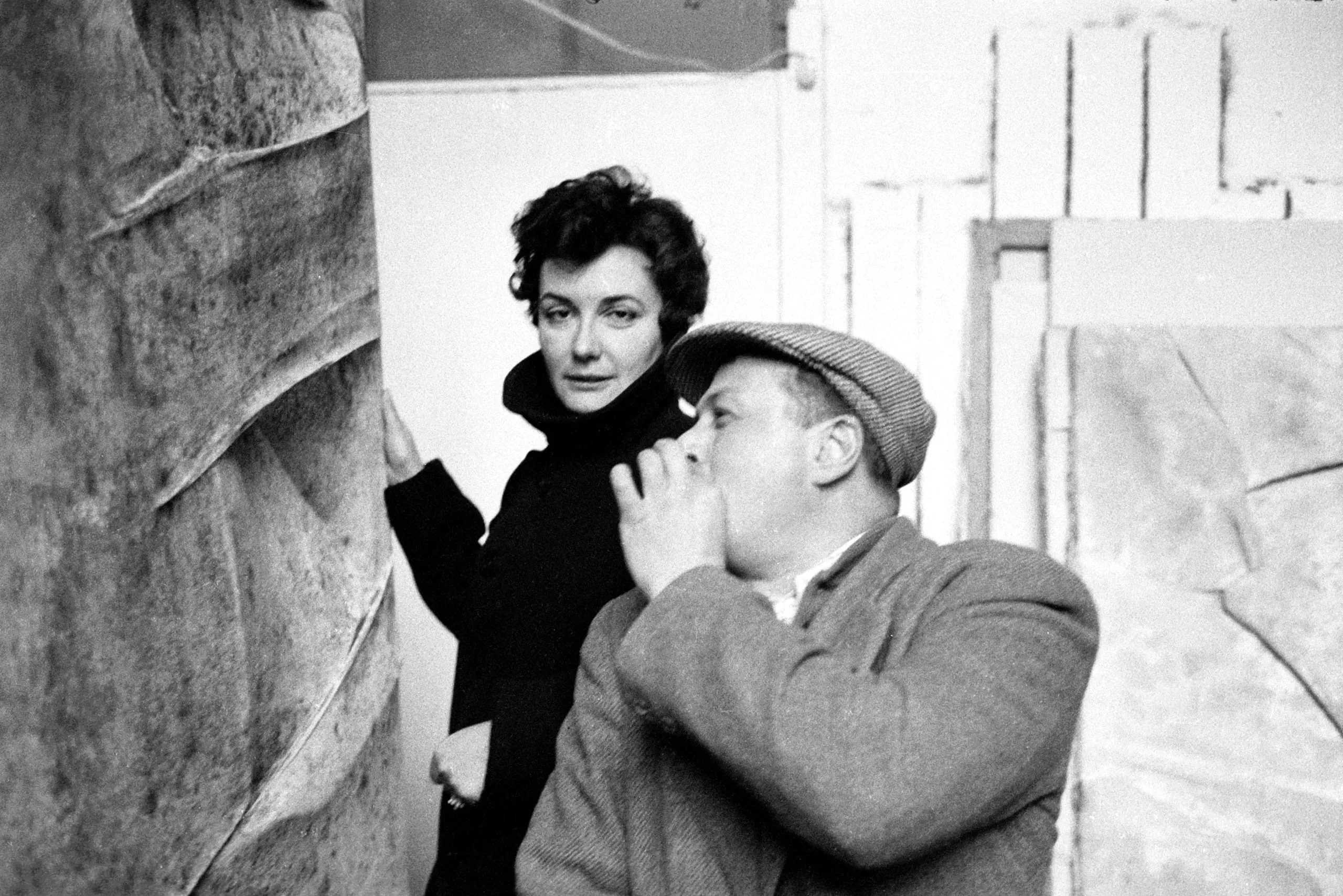 Black and white photograph of a woman and a man examining a large textured sculptural work in a studio, soft directional lighting