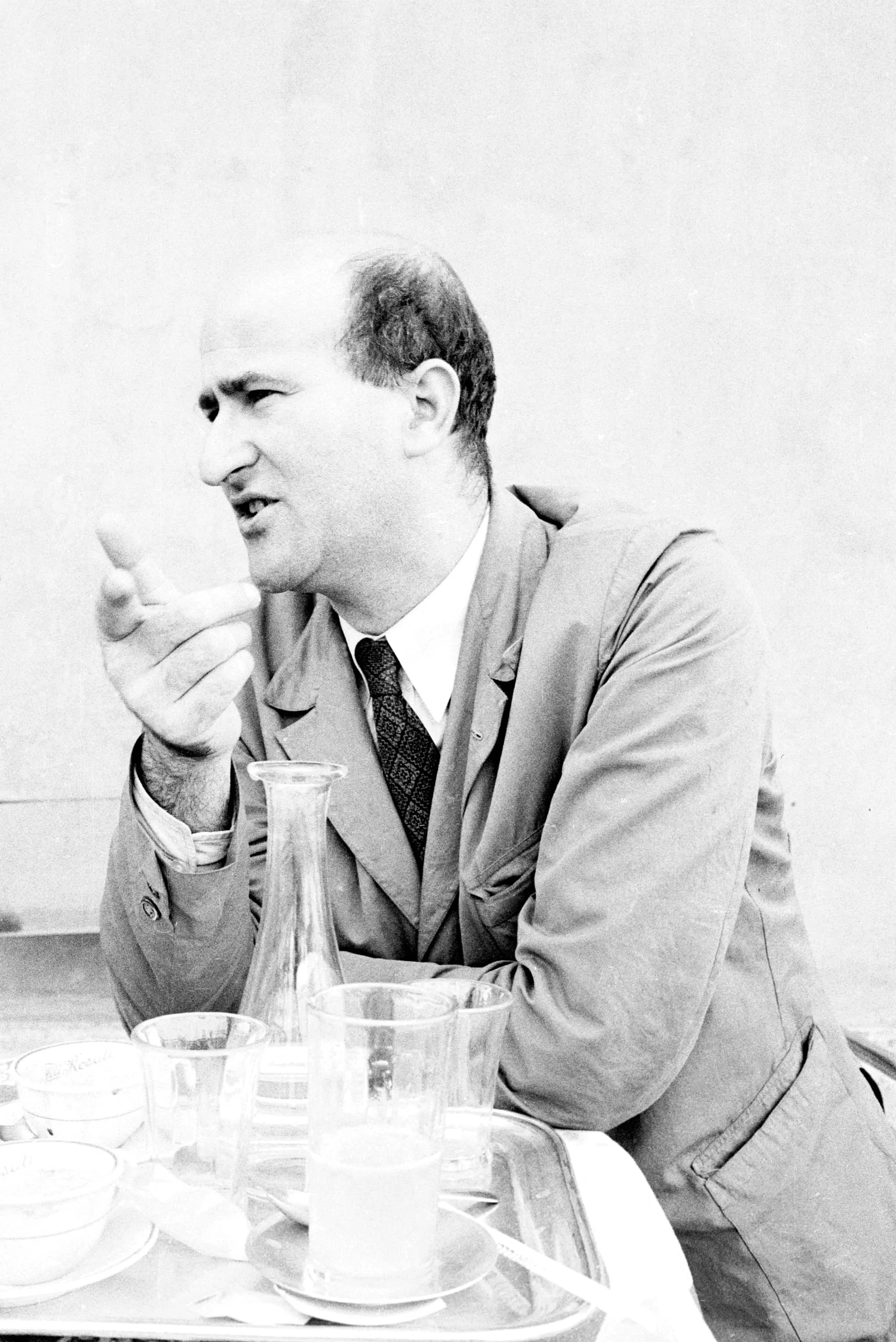 Black and white photograph of a man seated at a table in profile, mid-gesture with right hand raised, wearing a blazer and tie