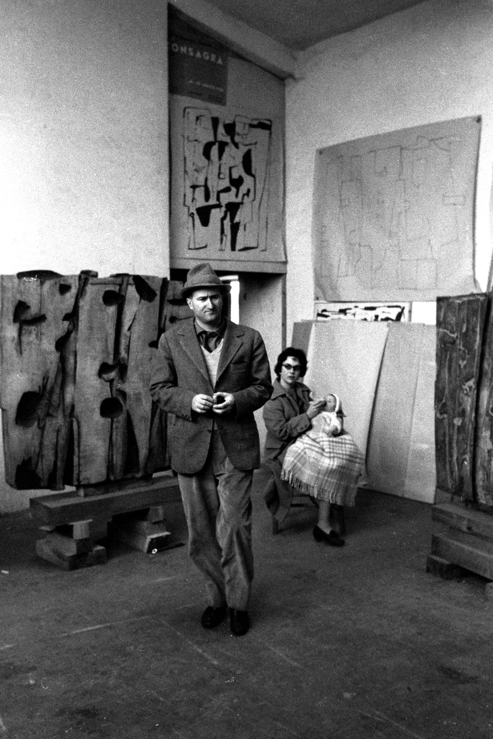 Black and white photograph of a man in a fedora and sport coat walking through an artist's studio, with sculptures and abstract works visible on the walls