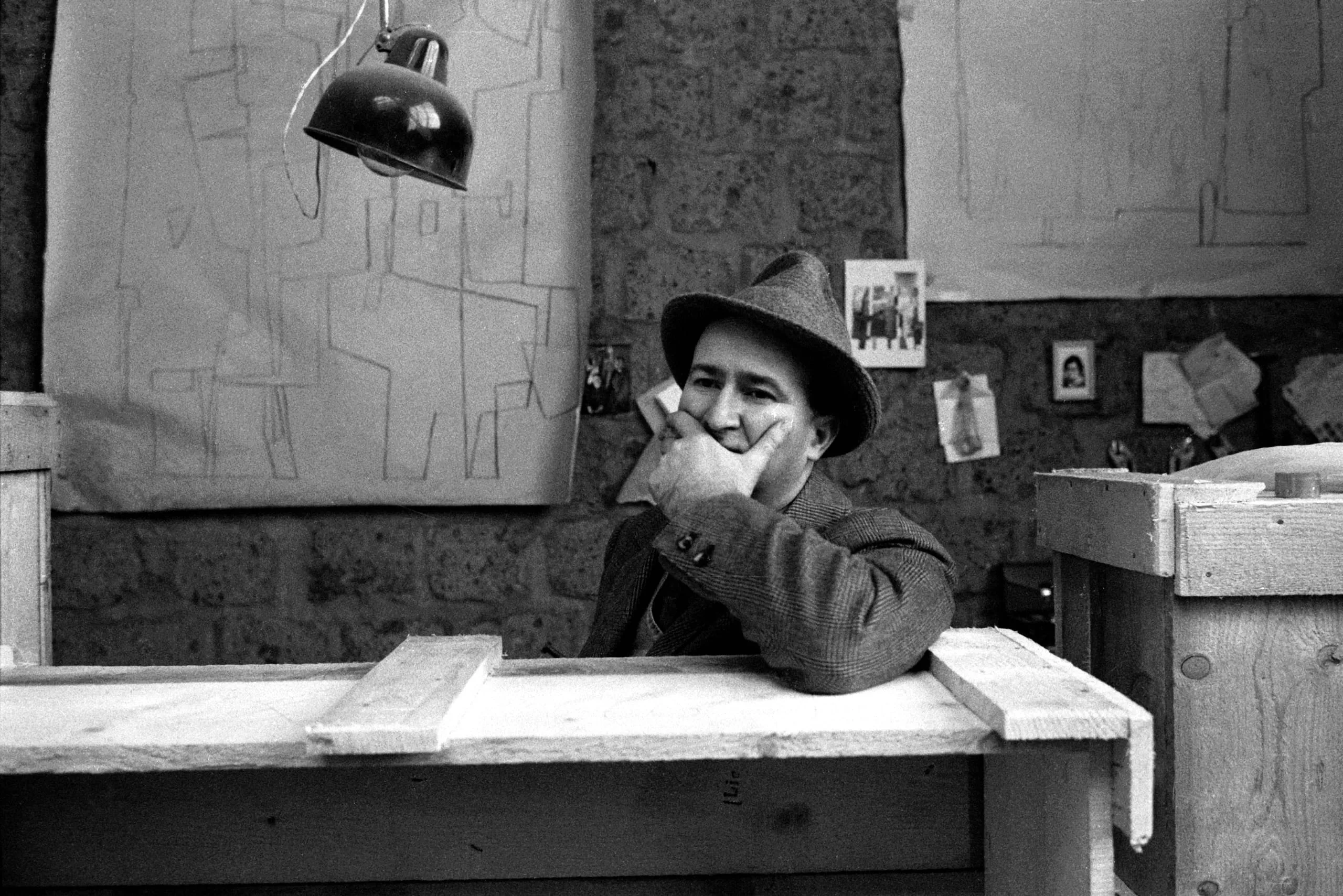 Black and white photograph of a smiling man in a felt hat and tweed jacket, hands cupped over his chin, seated behind a wooden bench in an artist's studio