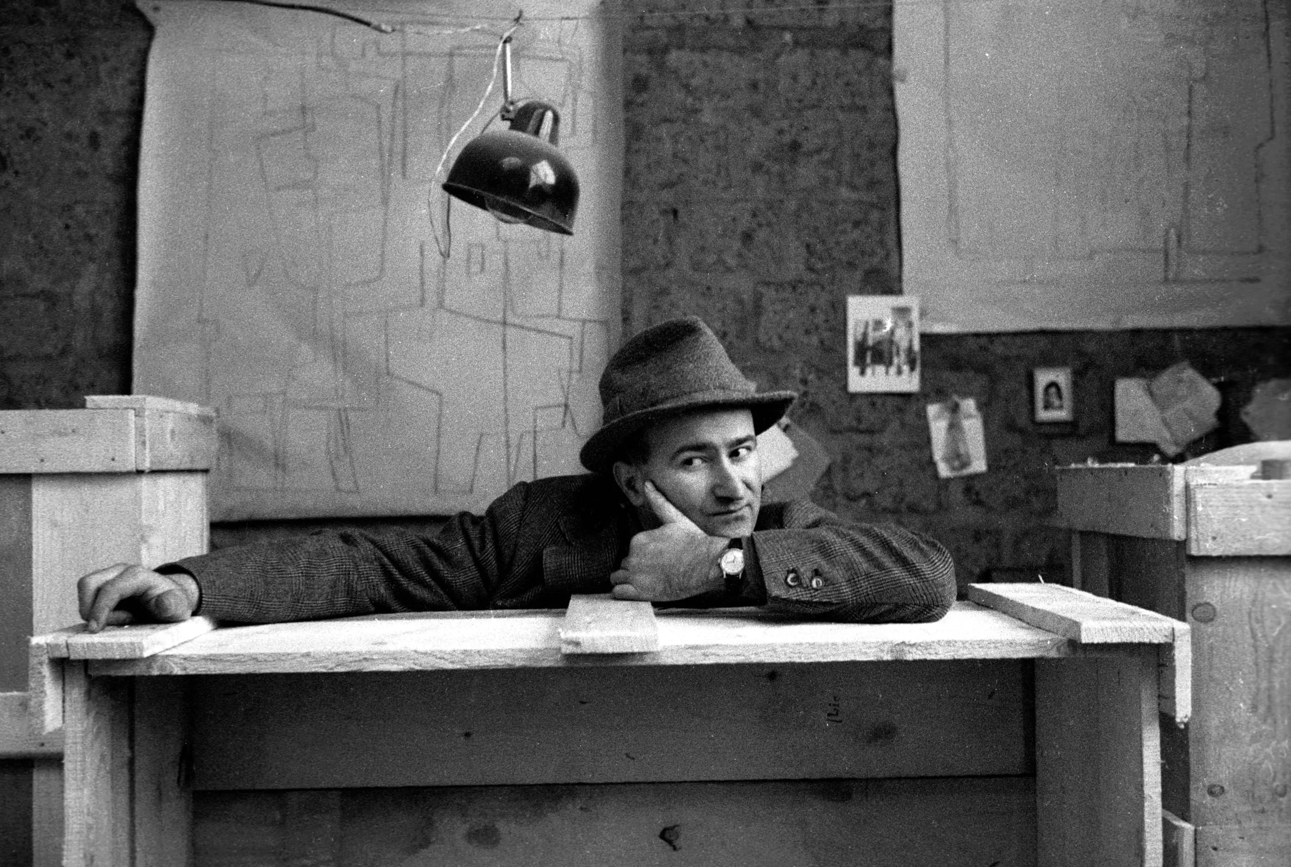 Black and white photograph of a white man in a felt hat leaning over a wooden crate in a studio, cheek resting in hand, large sketches pinned to the wall behind him