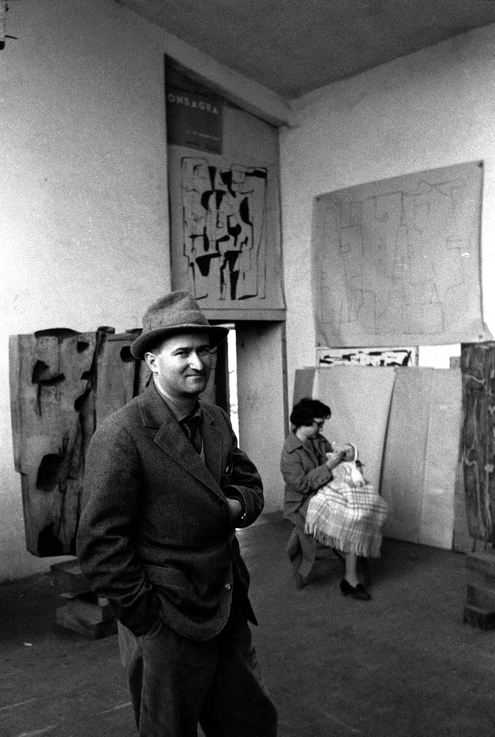 Black and white photograph of a man in a brimmed hat standing in an artist's studio, with abstract wood panels, a poster, and a seated woman visible behind him