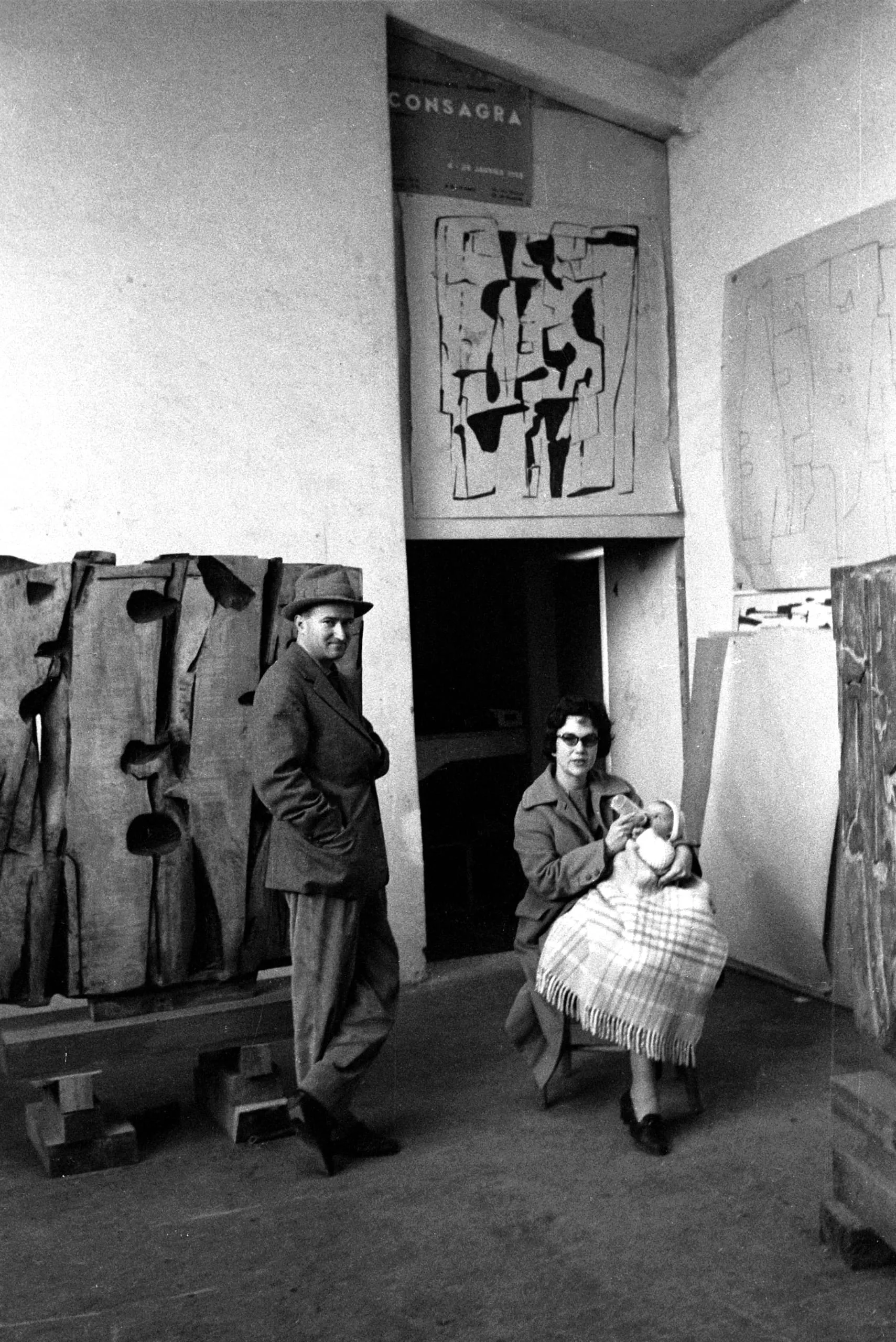 Black and white photograph of a man in a flat cap and a woman holding an infant in a plaid blanket inside an artist's studio, surrounded by tall carved sculptural forms and an abstract artwork hung above a doorway labeled 'CONSAGRA'