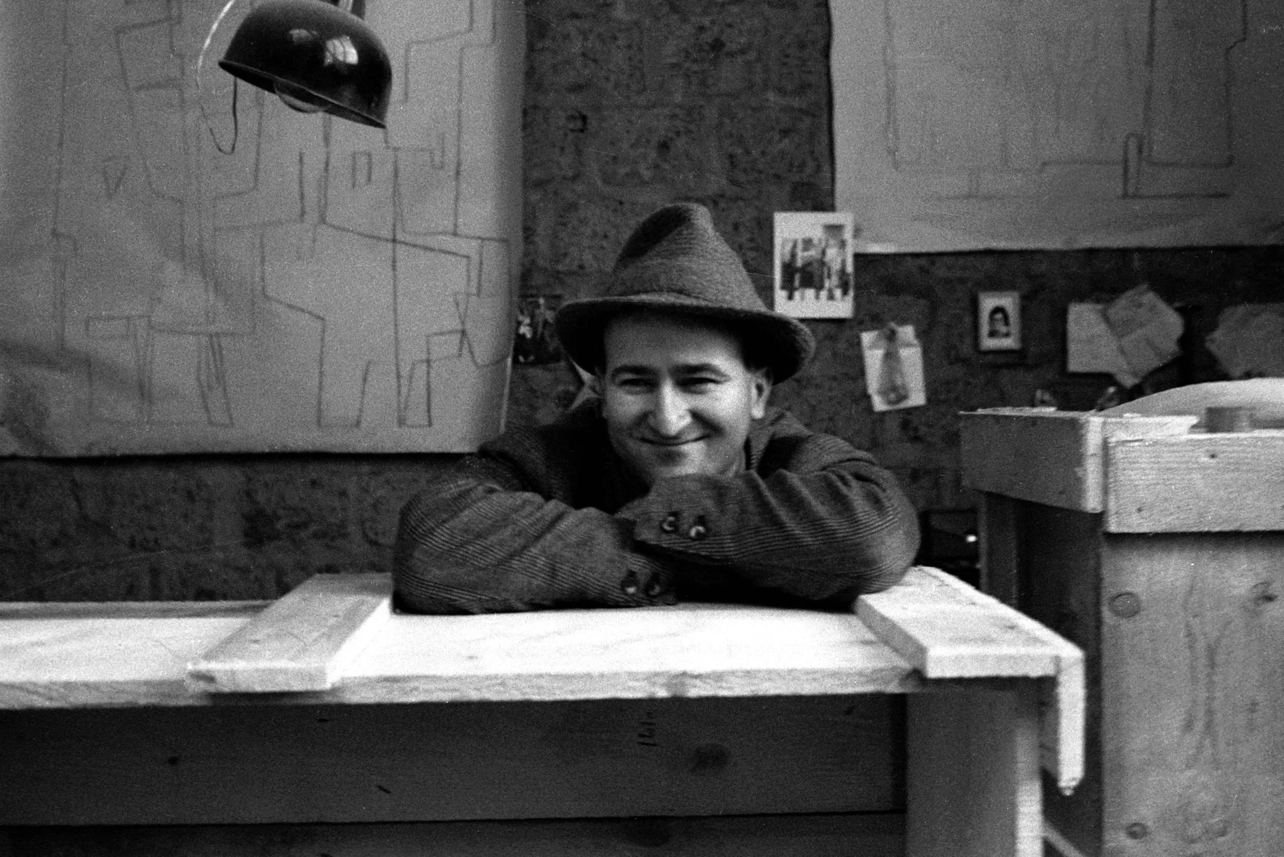 Black and white photograph of a smiling man in a felt fedora, chin resting on crossed forearms atop a pale wooden workbench, with sketched geometric drawings pinned to the wall behind him