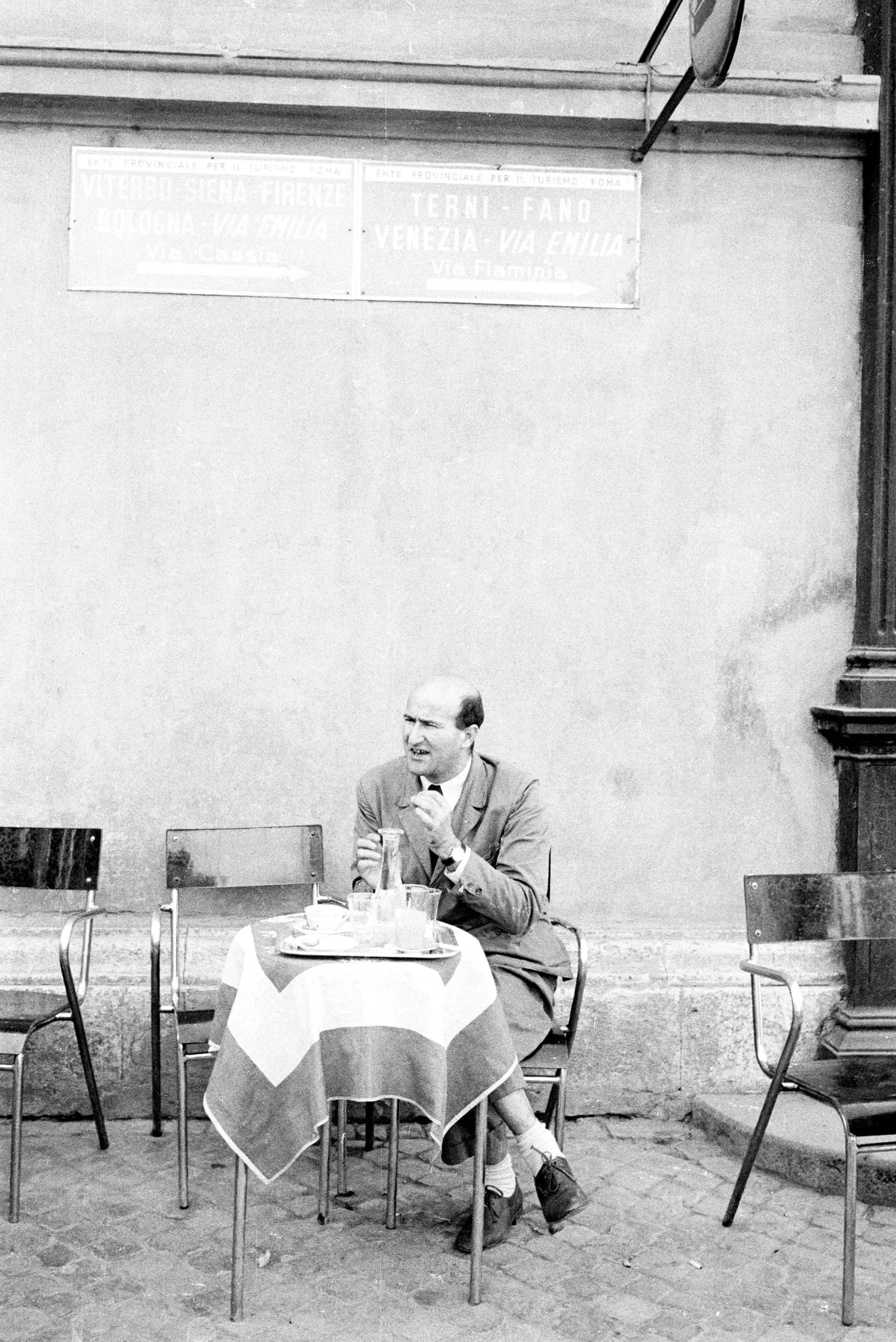 Black and white photograph of a balding white man in a suit seated alone at a striped-cloth café table outdoors, mid-gesture, Italian road signs on the wall behind him