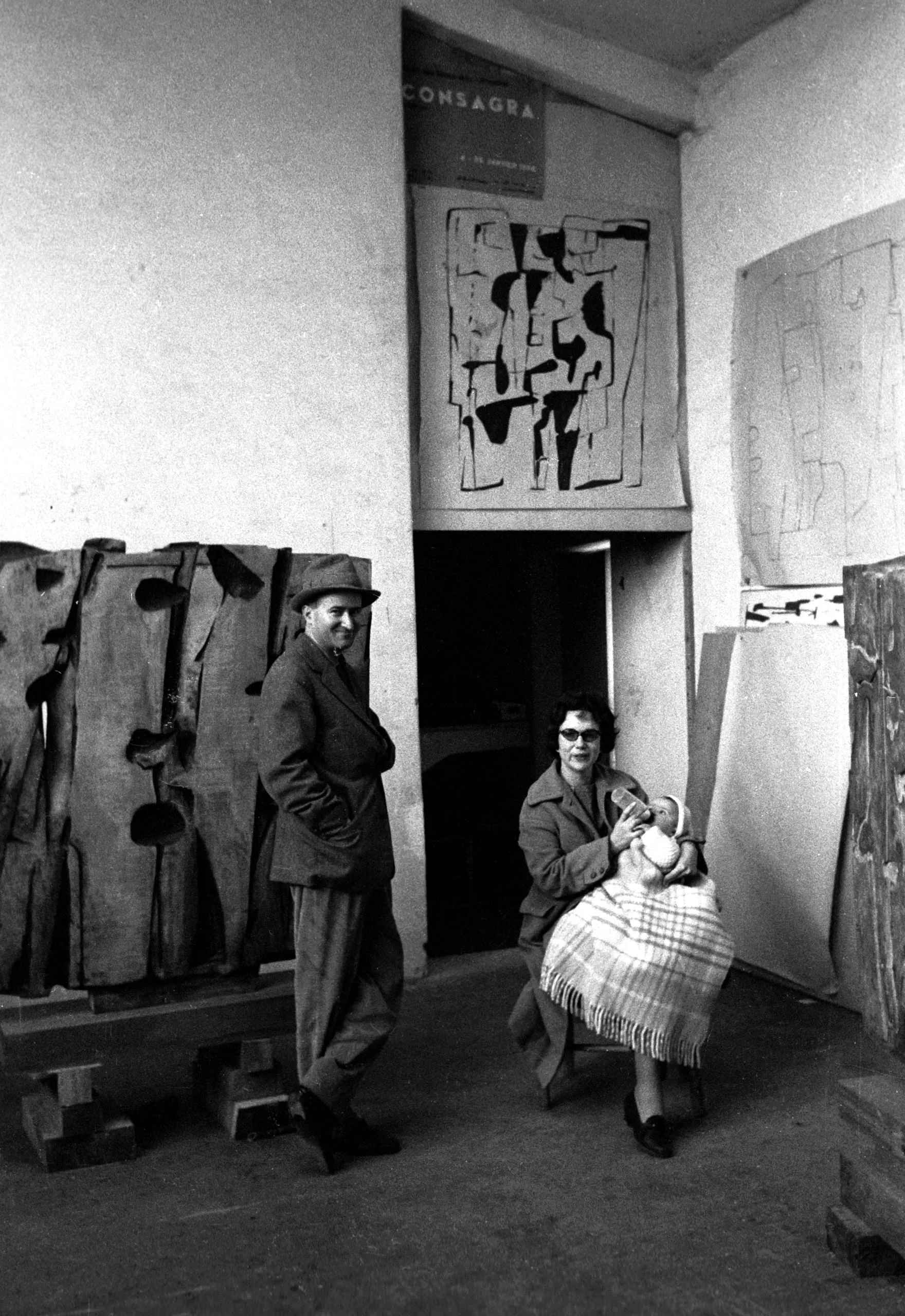 Black and white photograph of a man and a woman holding an infant inside an artist's studio, with large abstract sculptures to the left and an exhibition poster reading 'CONSAGRA' above a doorway