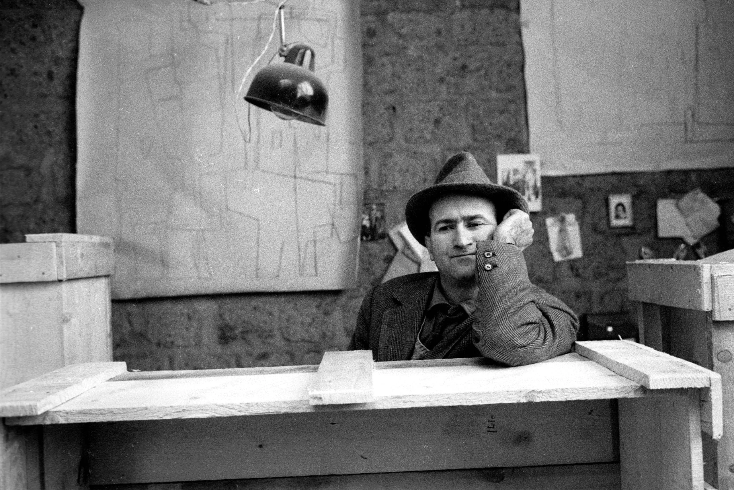 Black and white photograph of a man in a felt hat and tweed jacket leaning on a wooden workbench, bandaged hand raised to his face, in a studio with sketches pinned to a brick wall